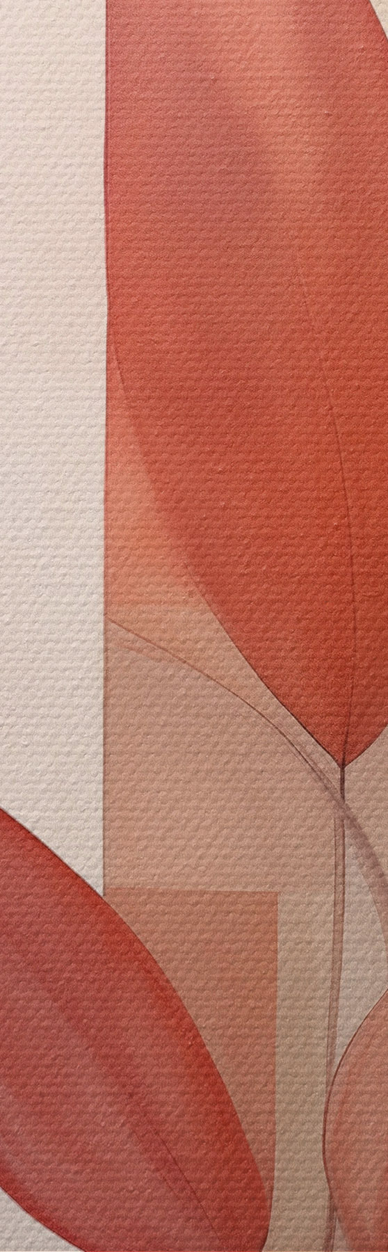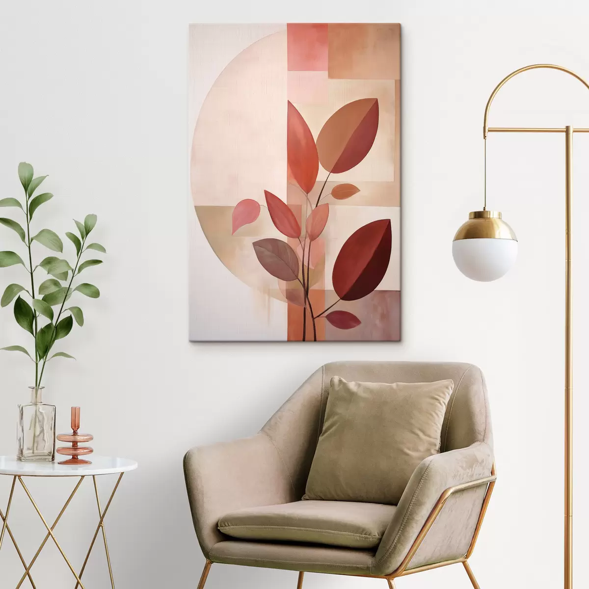 Obraz Abstrakcyjna roślina o czerwonych liściach na tle geometrycznych kształtów i delikatnych, stonowanych kolorów. s47041