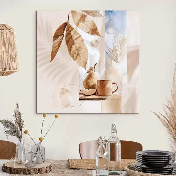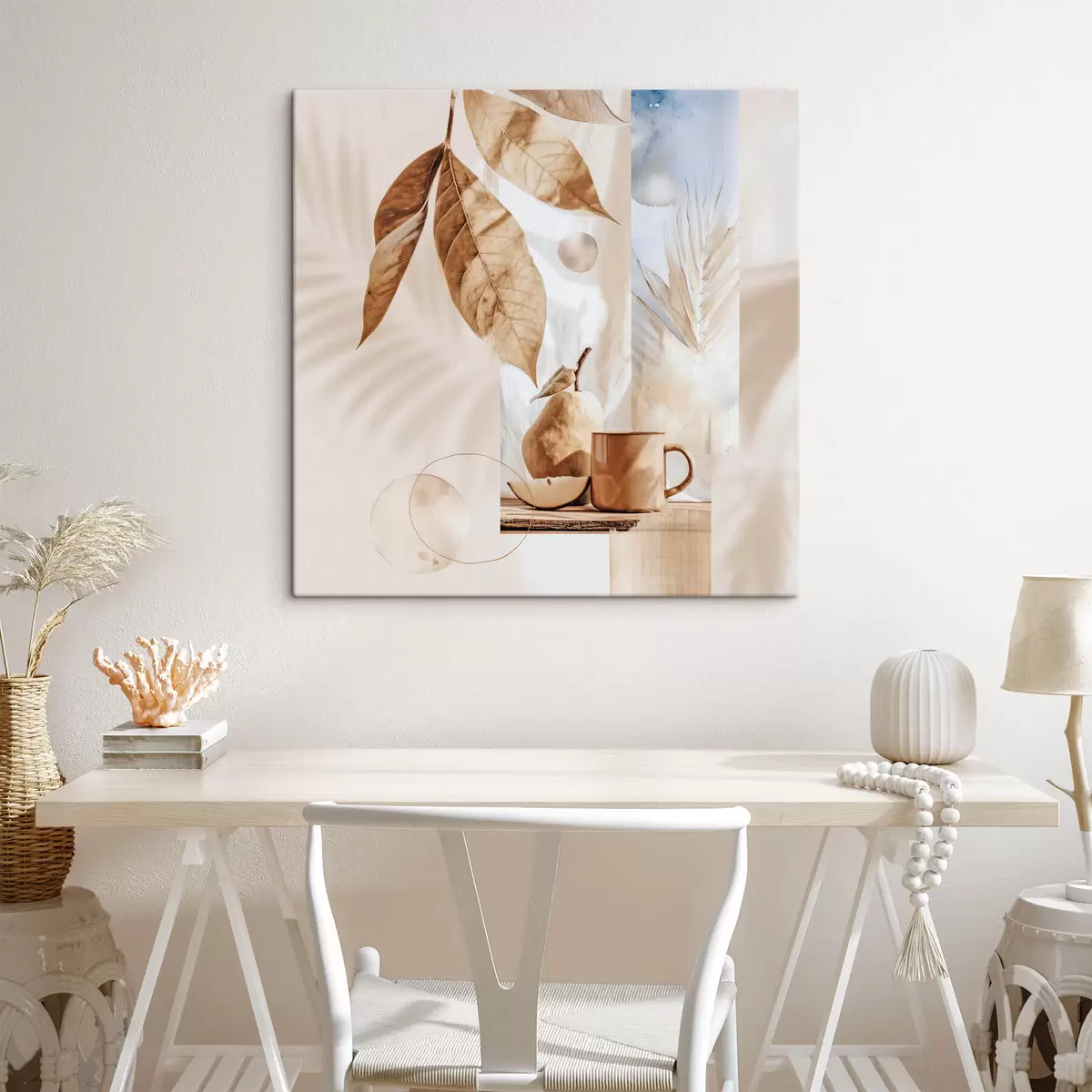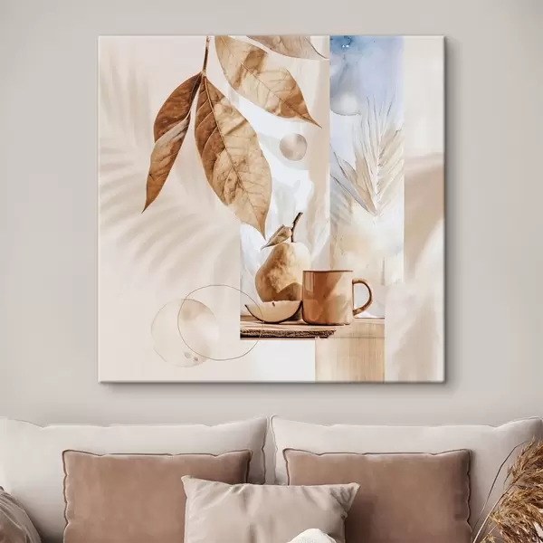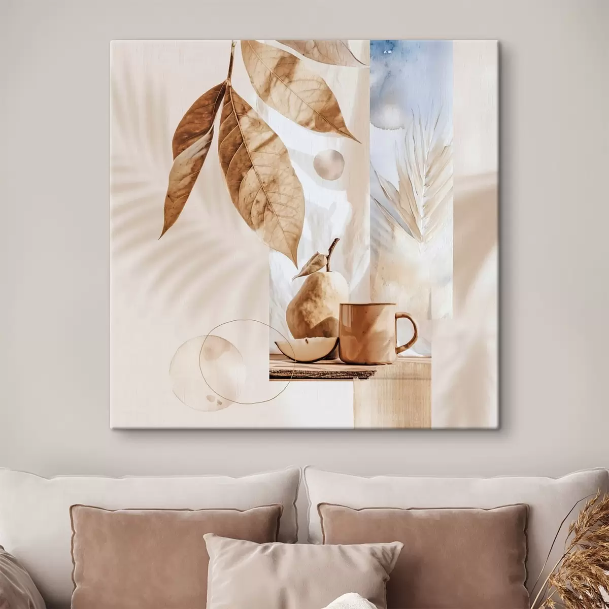 Obraz Abstrakcja z liśćmi, gruszką i filiżanką Nr s47047