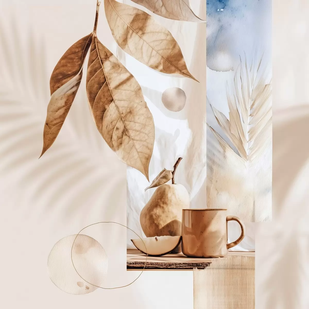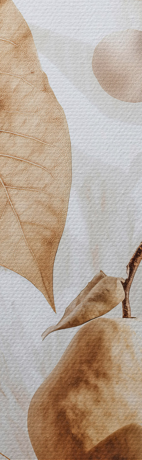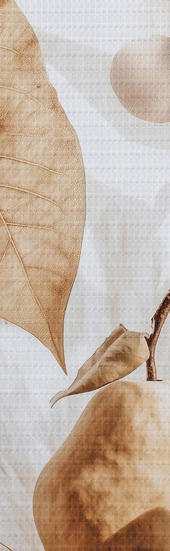 Obraz Abstrakcja z liśćmi, gruszką i filiżanką Nr s47047