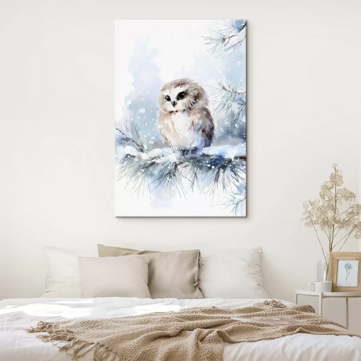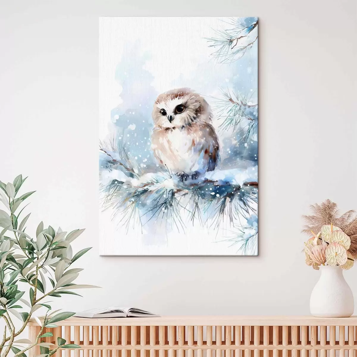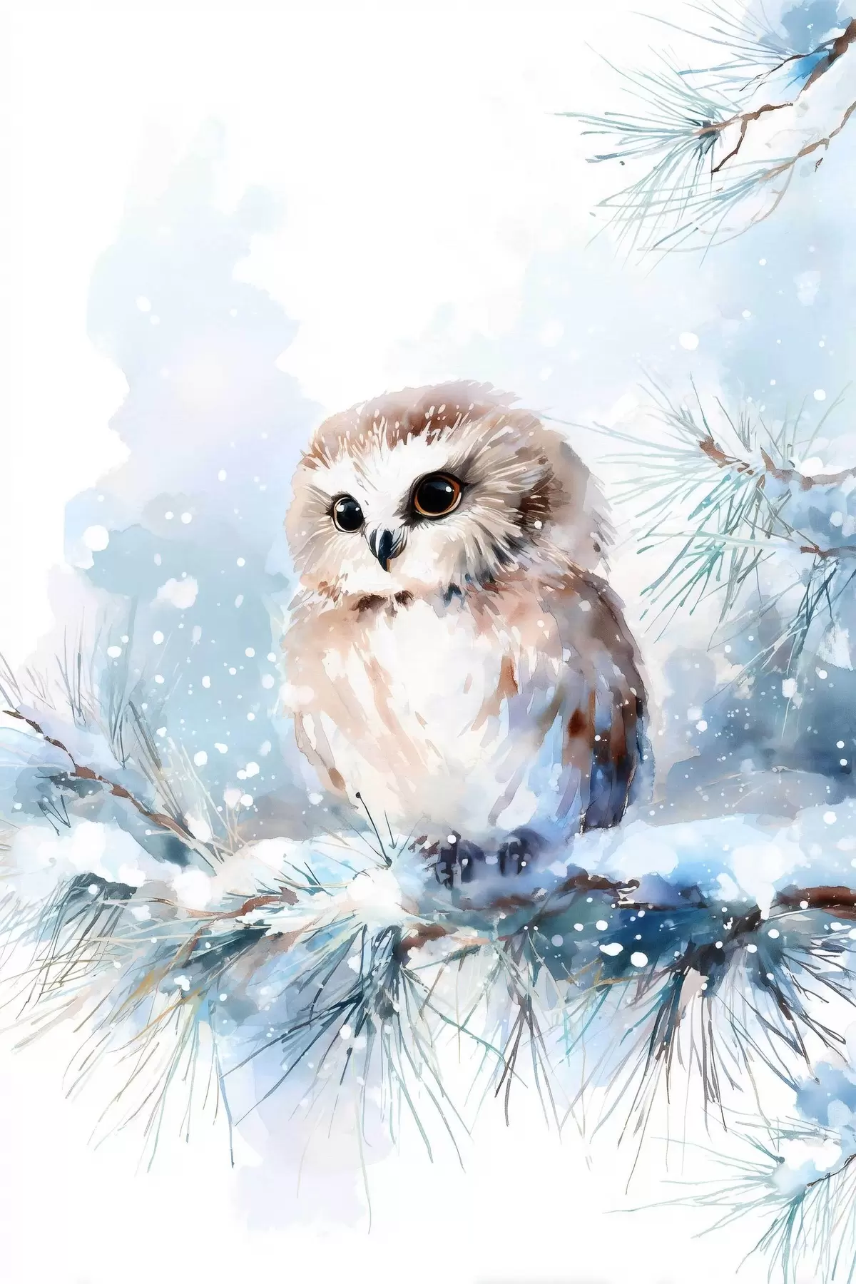 Obraz urocza sowa na pokrytej śniegiem gałęzi sosny w stylu akwareli Nr s47115