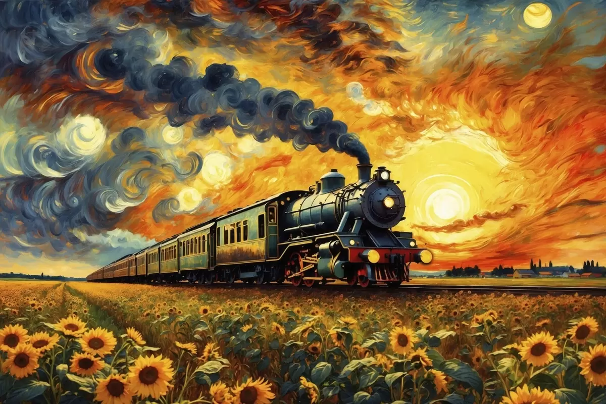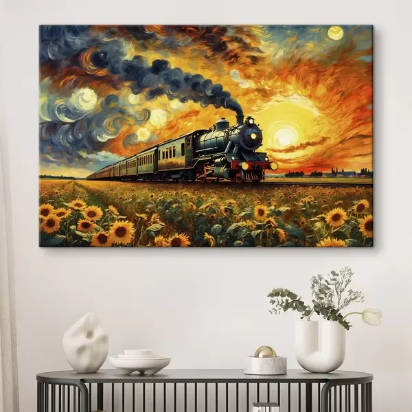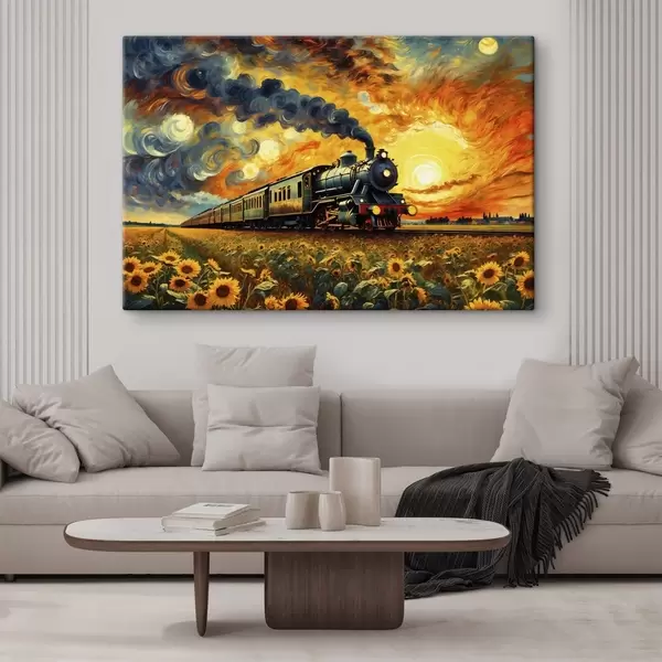 Obraz Pociąg parowy na polu z dramatycznym niebem Nr s47257