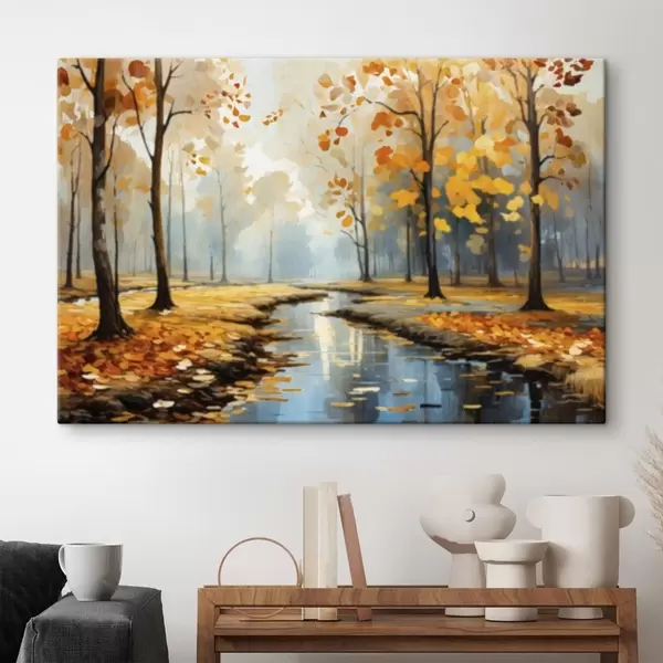Obraz Jesienny las ze strumieniem i żółtymi liśćmi s47278