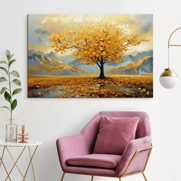 Obraz Drzewo z żółtymi liśćmi w górskiej scenerii Nr s47285