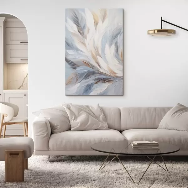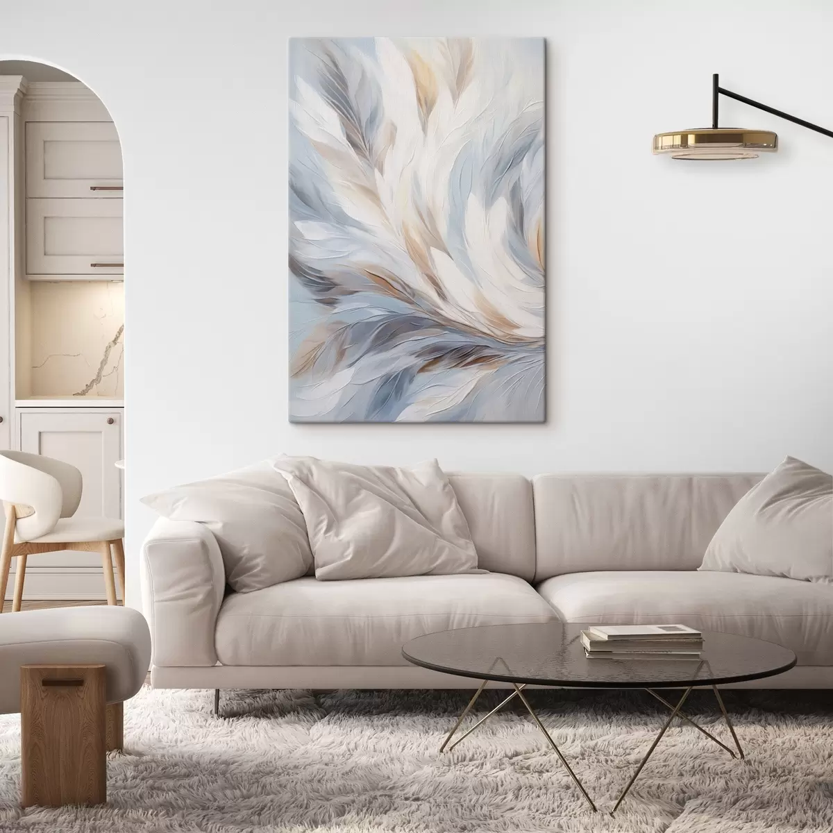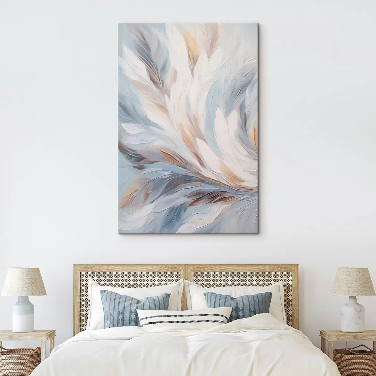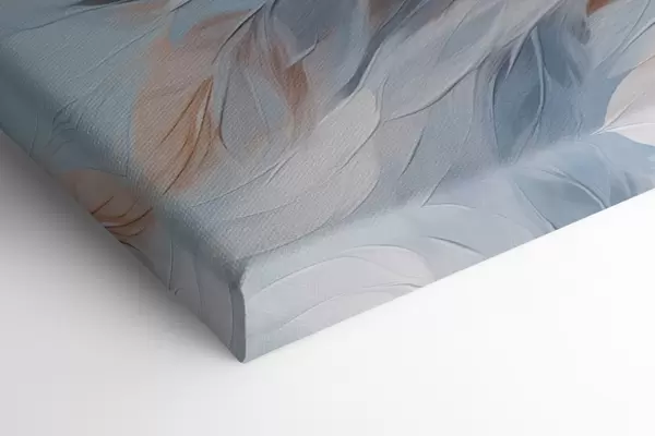 Obraz Abstrakcyjny obraz przedstawiający pióra w odcieniach bieli, błękitu i brązu, o miękkiej, płynnej fakturze i jasnym tle. s47417