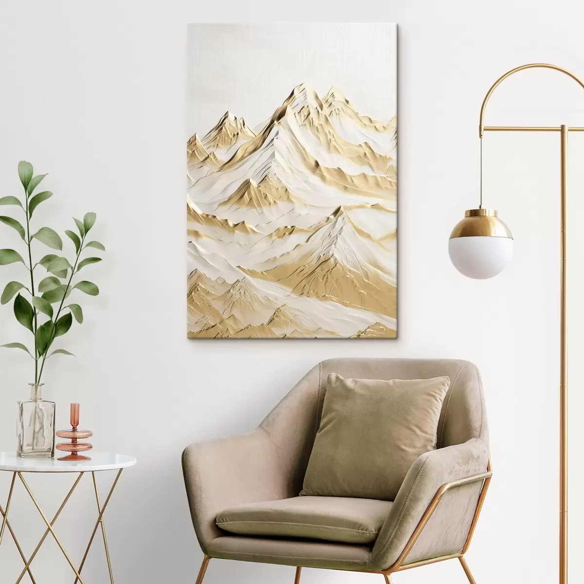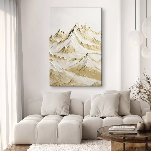 Obraz Krajobraz żółtych, pokrytych śniegiem gór o ostrych szczytach i głębokich dolinach pod jasnym niebem. Nr s47420