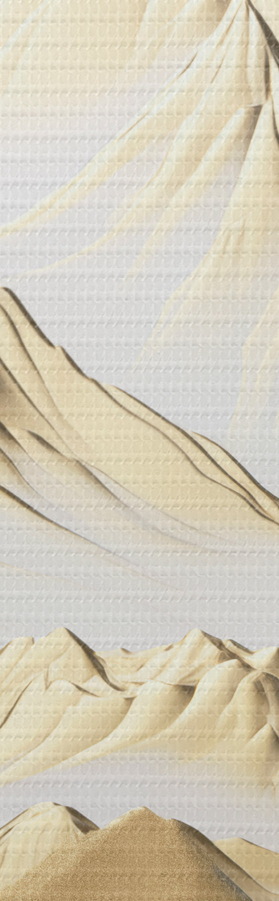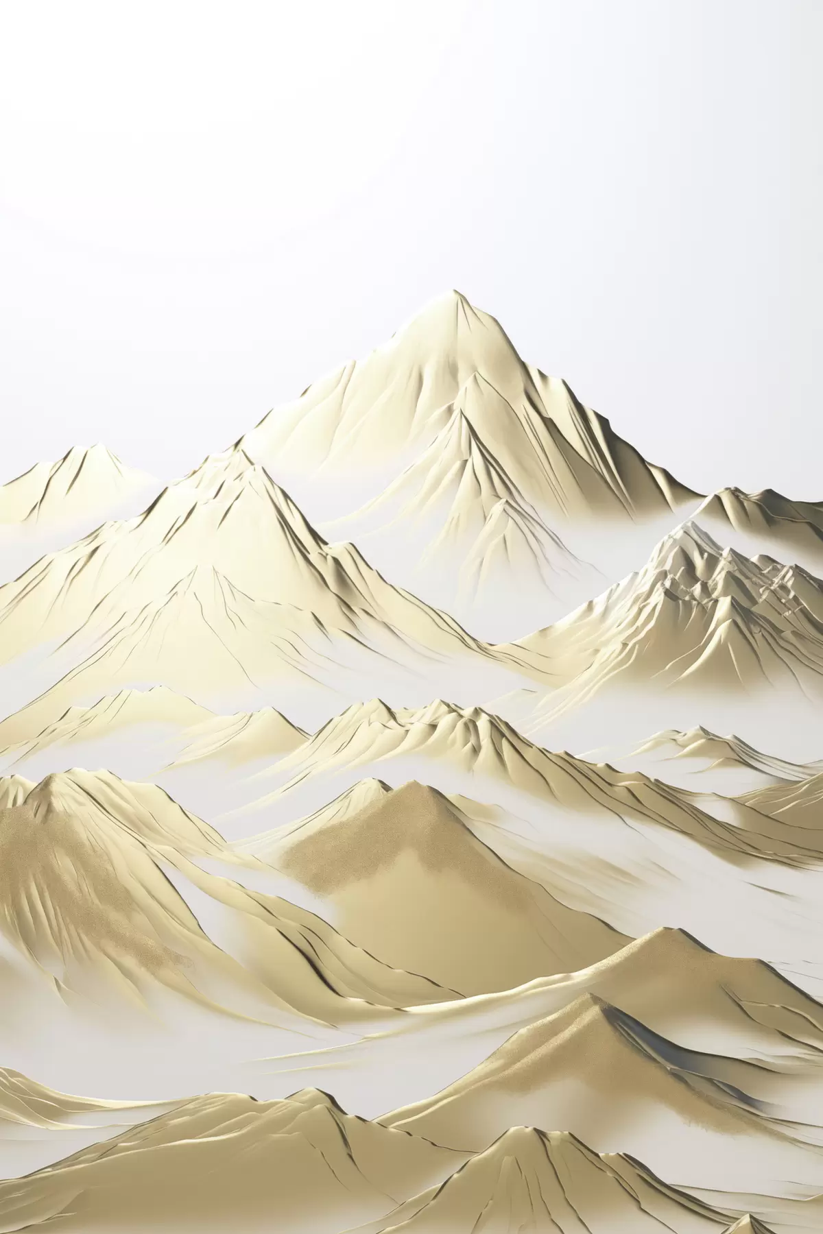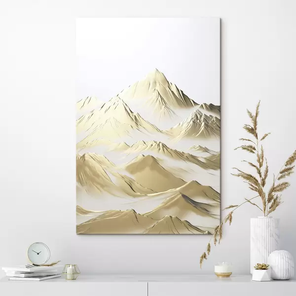Obraz Krajobraz żółtych, pokrytych śniegiem gór o ostrych szczytach i głębokich dolinach pod jasnym niebem. Nr s47421