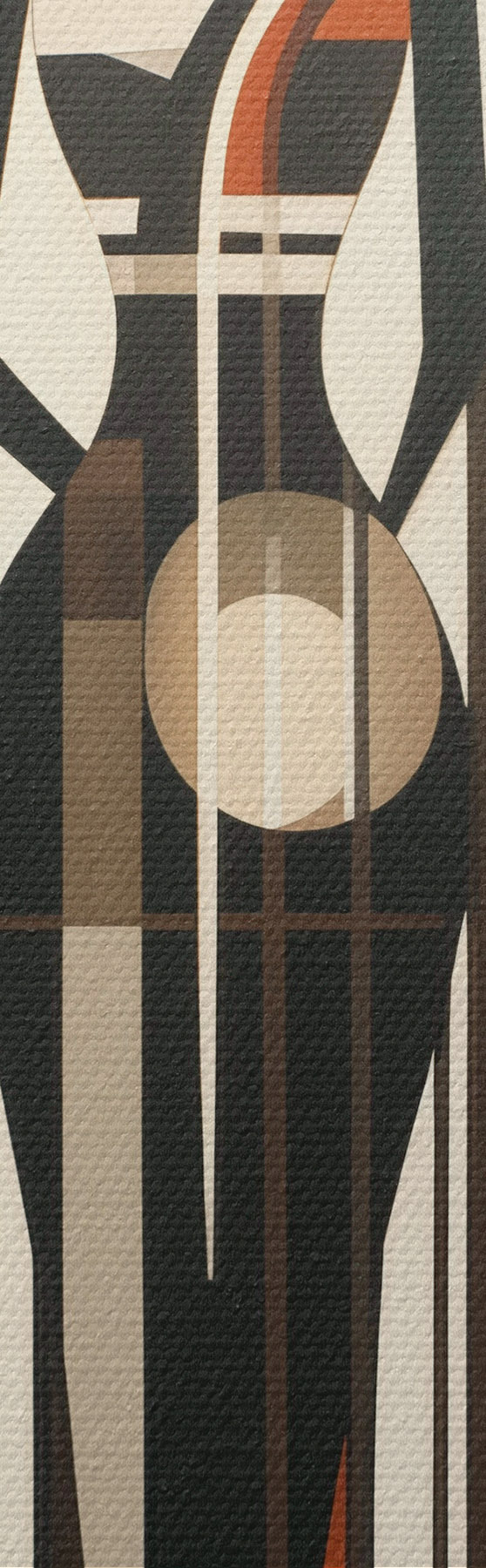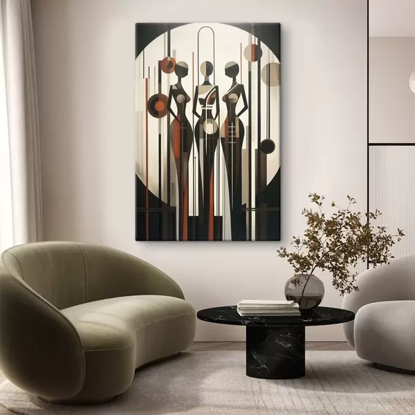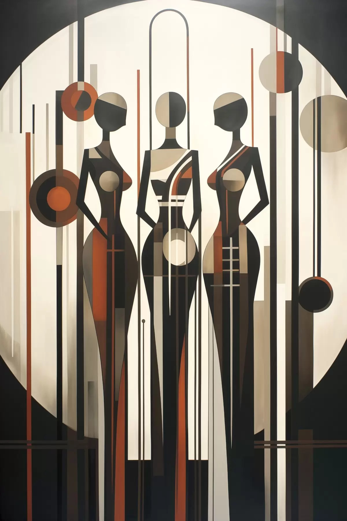 Obraz Stylizowane postacie kobiece z elementami geometrycznymi na abstrakcyjnym tle pionowych linii i okręgów Nr s47422