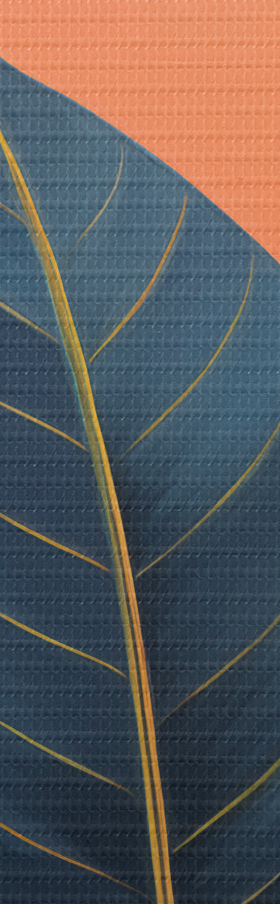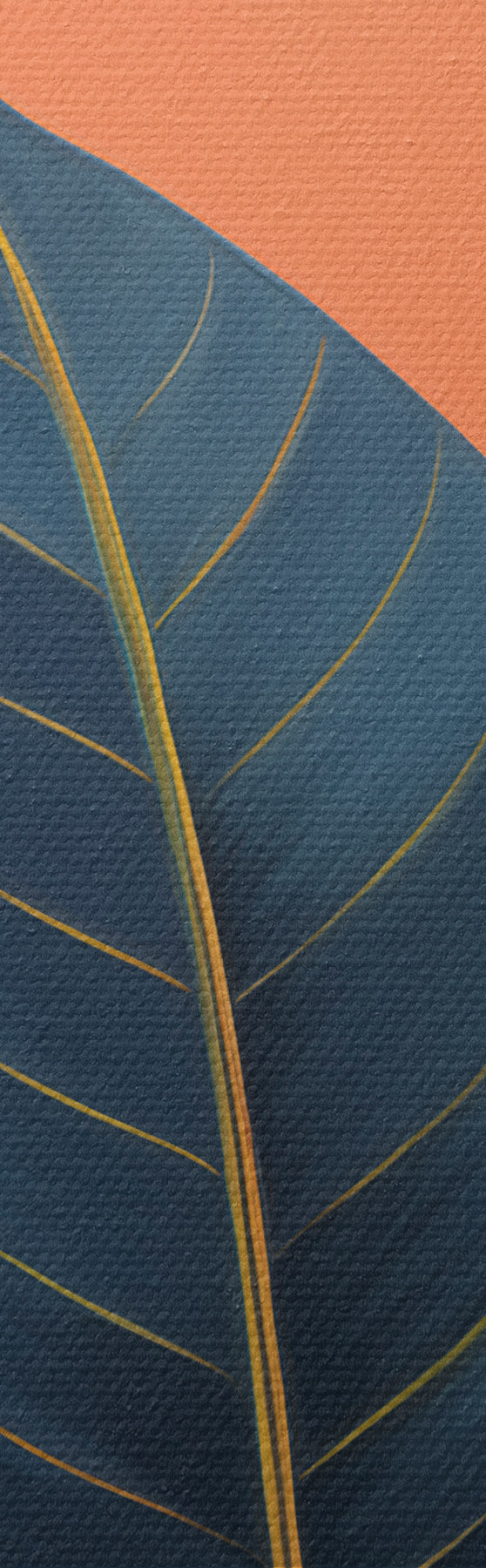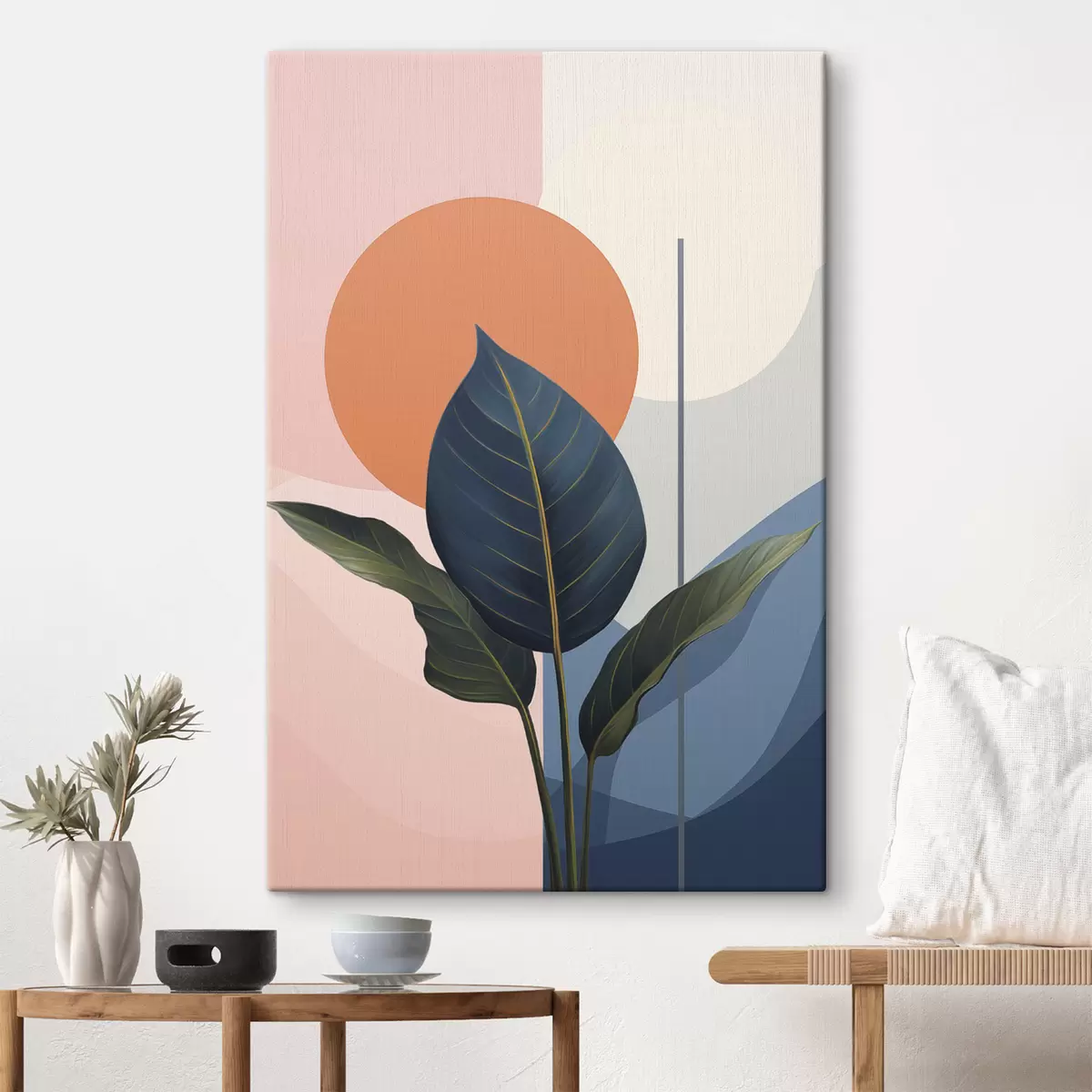 Obraz Ciemne liście na tle abstrakcyjnych kształtów w kolorze brzoskwiniowym i szarym z pomarańczowym okręgiem Nr s47425