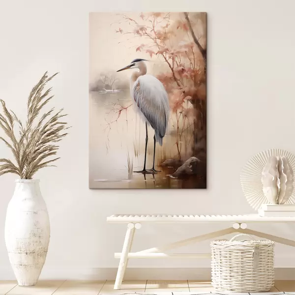 Obraz Czapla stoi na skale w jeziorze, a w tle widać wysokie trawy i drzewa. s47427