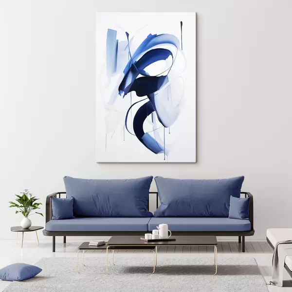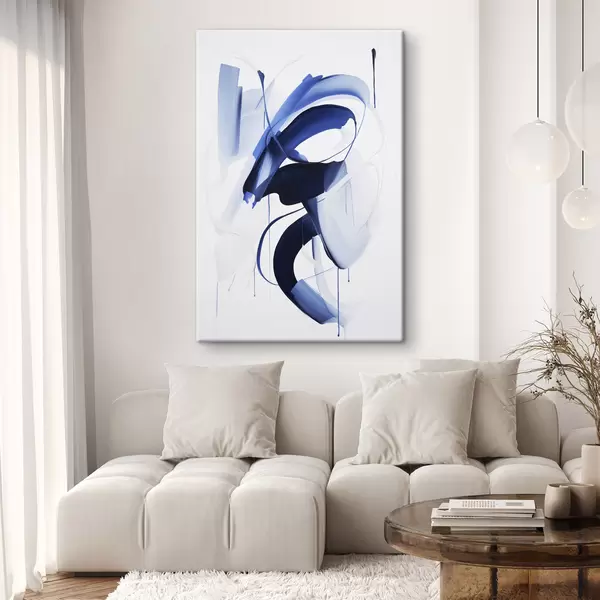 Obraz Abstrakcyjne niebieskie kształty przypominające pociągnięcia pędzla, z płynnymi liniami i krzywiznami na białym tle, sztuka nowoczesna Nr s47428