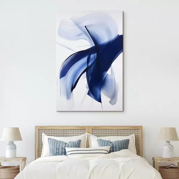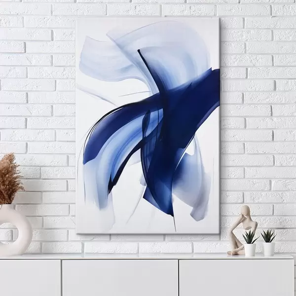 Obraz Abstrakcyjne niebieskie kształty przypominające pociągnięcia pędzla, z płynnymi liniami i krzywiznami na białym tle, sztuka nowoczesna Nr s47429