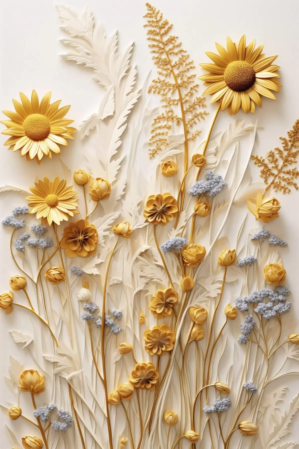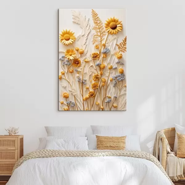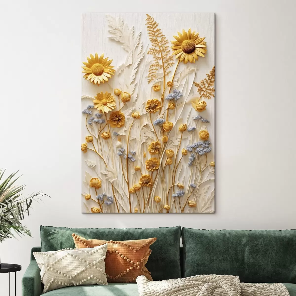Obraz Teksturowana kolekcja żółtych i białych stokrotek z suszonymi trawami i gałązkami lawendy na białym tle. Nr s47431