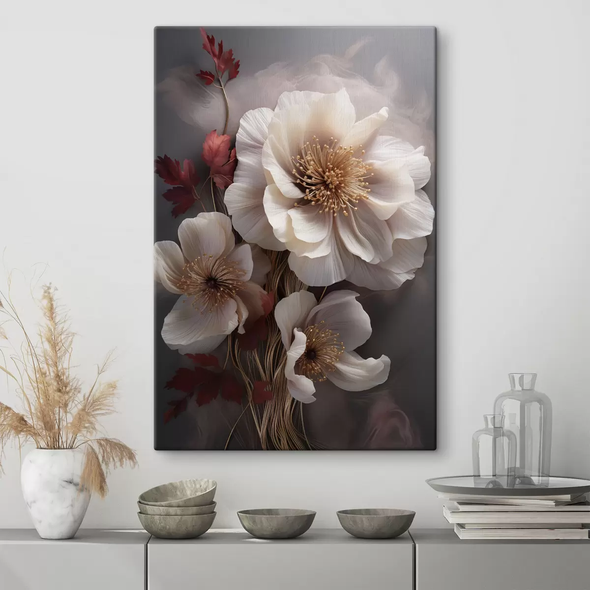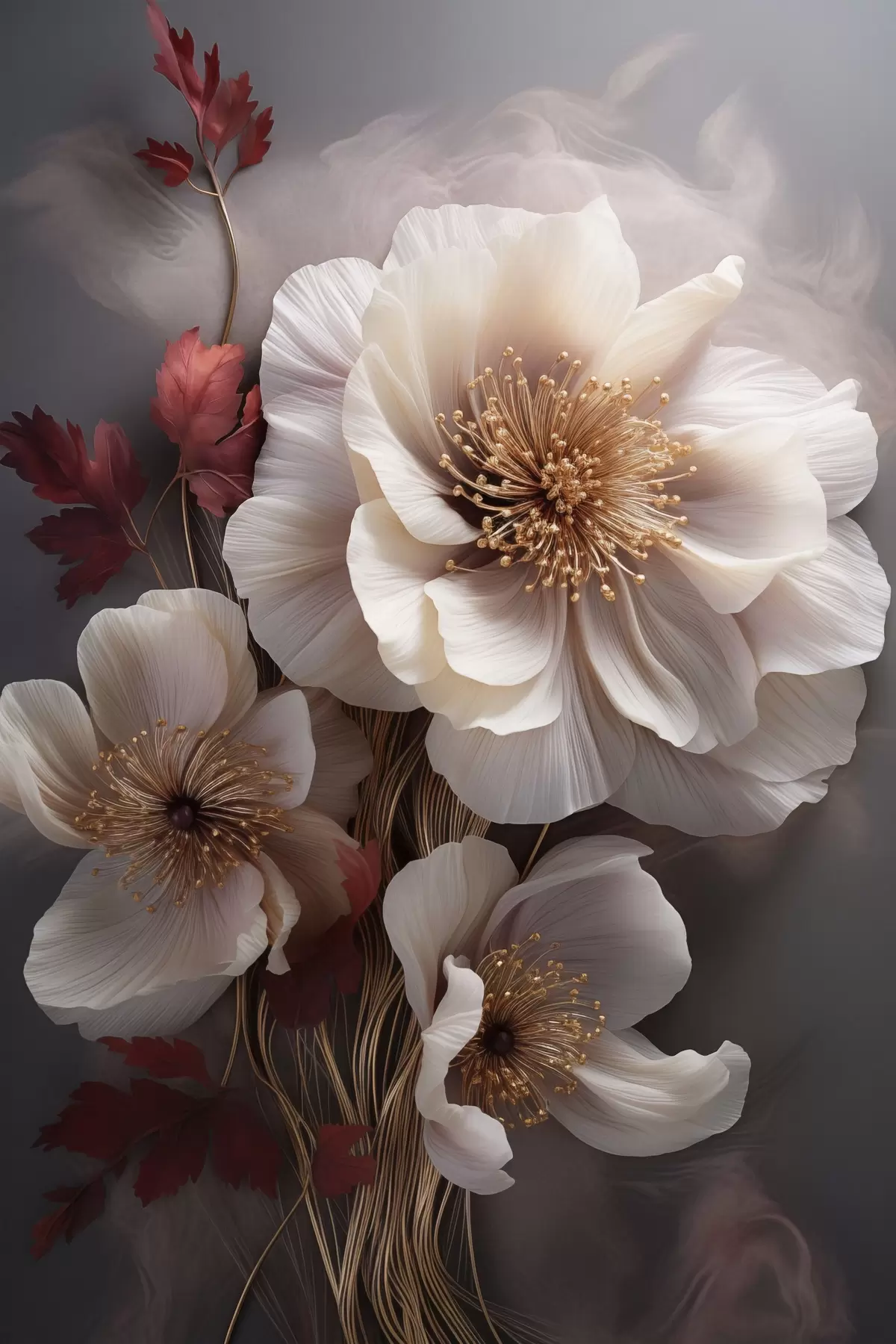 Obraz Delikatne piwonie o cienkich, delikatnych płatkach, otoczone ciemnoczerwonymi liśćmi na abstrakcyjnym tle. Nr s47434