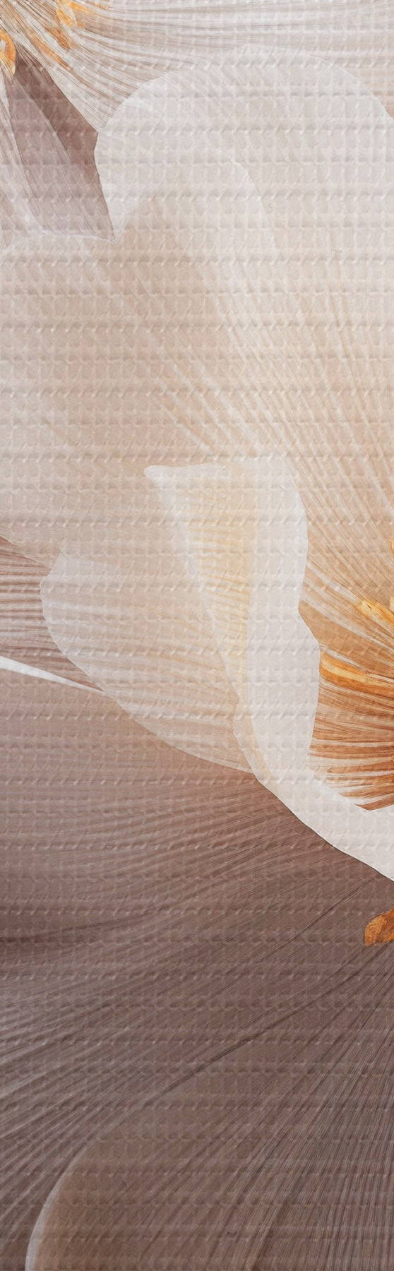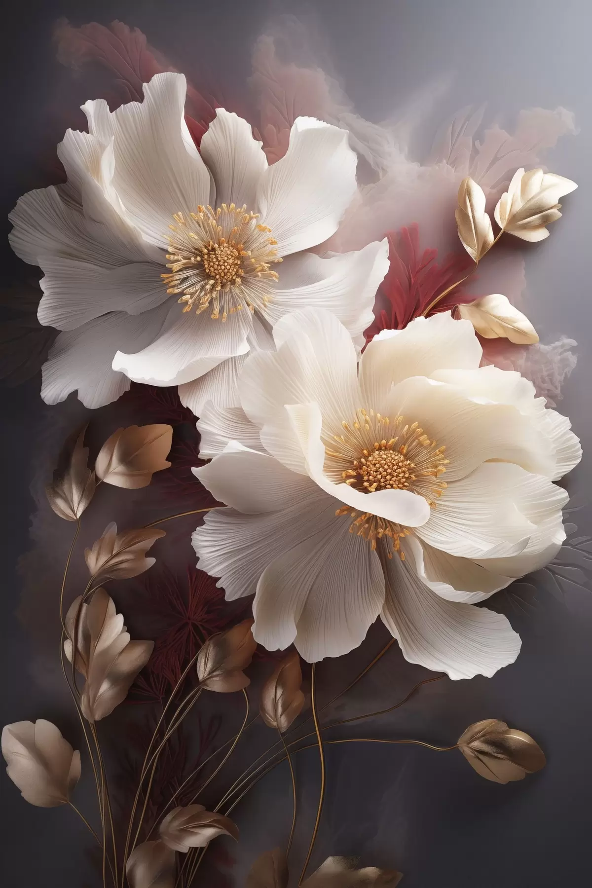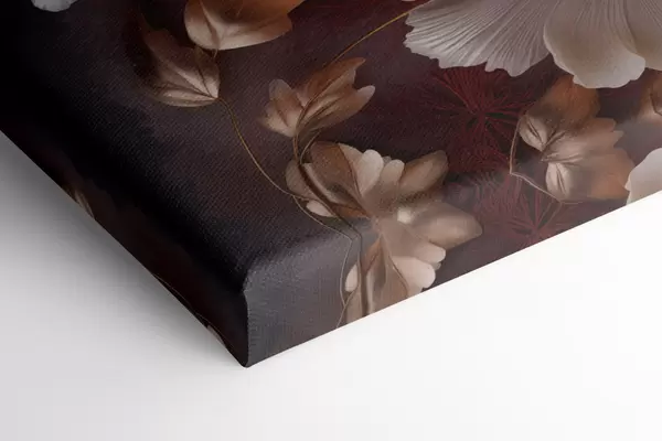 Obraz Delikatne piwonie o cienkich, delikatnych płatkach, otoczone ciemnoczerwonymi i żółtymi liśćmi na abstrakcyjnym tle. Nr s47435