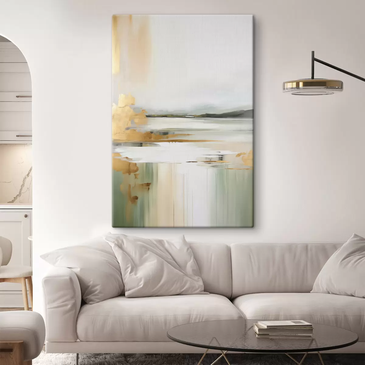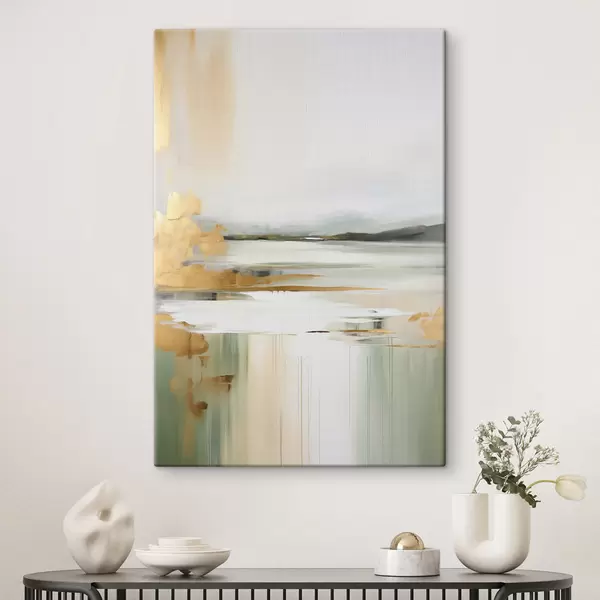 Obraz Abstrakcyjny krajobraz w odcieniach żółci i zieleni, woda odbijająca niebo i odległe góry, blade, zamglone niebo. Nr s47438
