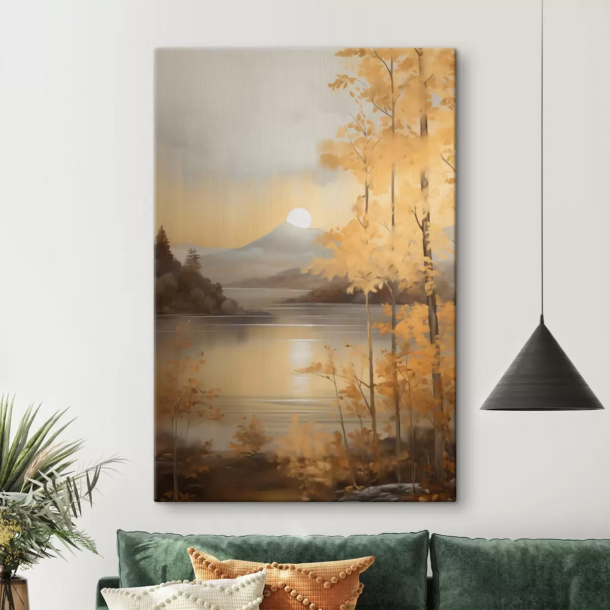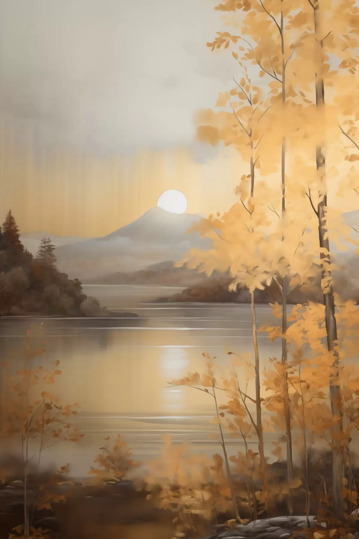 Obraz Jesienne drzewa o pomarańczowych liściach otaczają spokojne jezioro z odległymi górami pod zachmurzonym niebem. Nr s47440