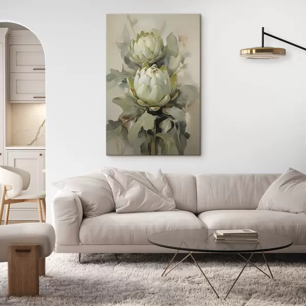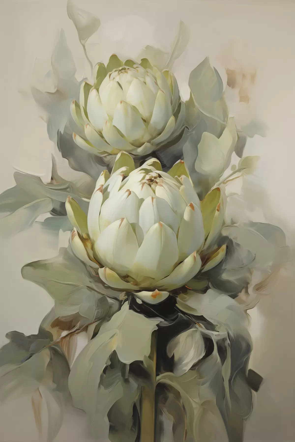 Obraz Styl malarski przedstawiający kilka białych kwiatów protei z dużymi zielonymi liśćmi na jasnym tle. Nr s47862