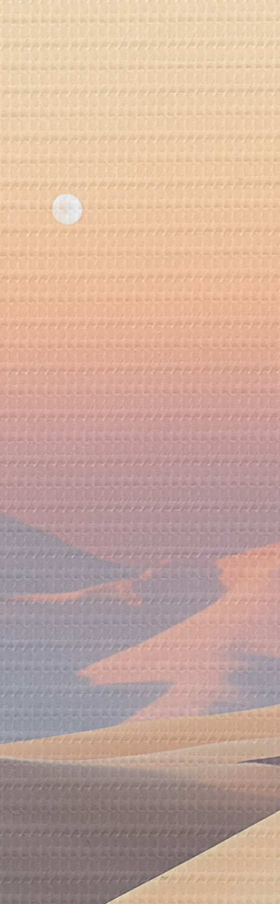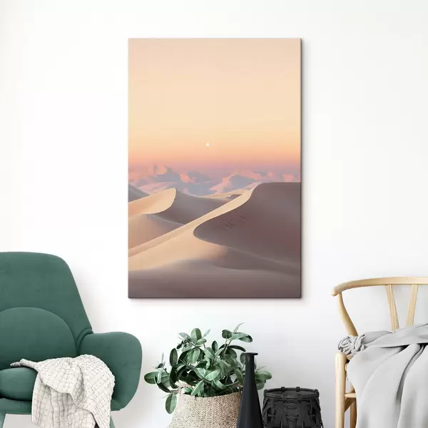 Obraz Pustynny krajobraz z falującymi wydmami pod delikatnym pastelowym niebem, w tle odległe góry. Nr s47865