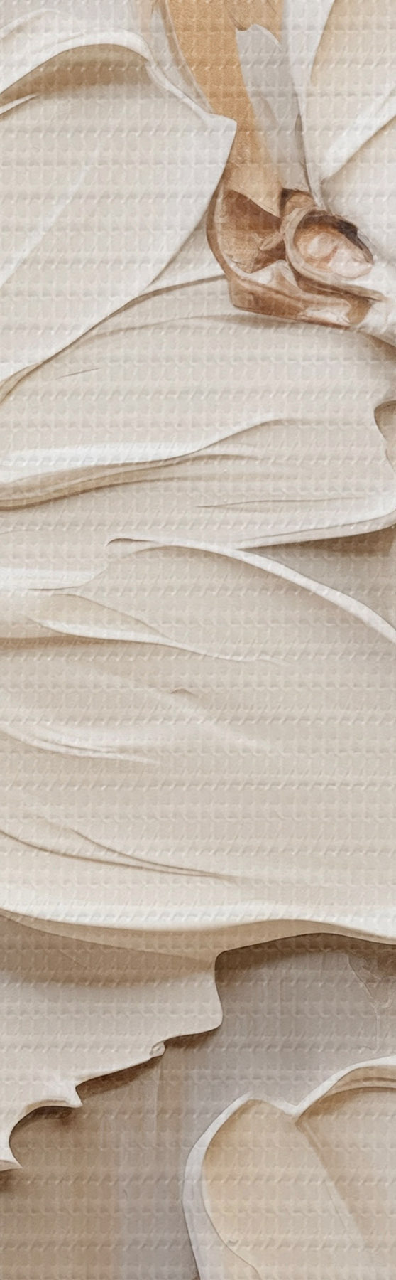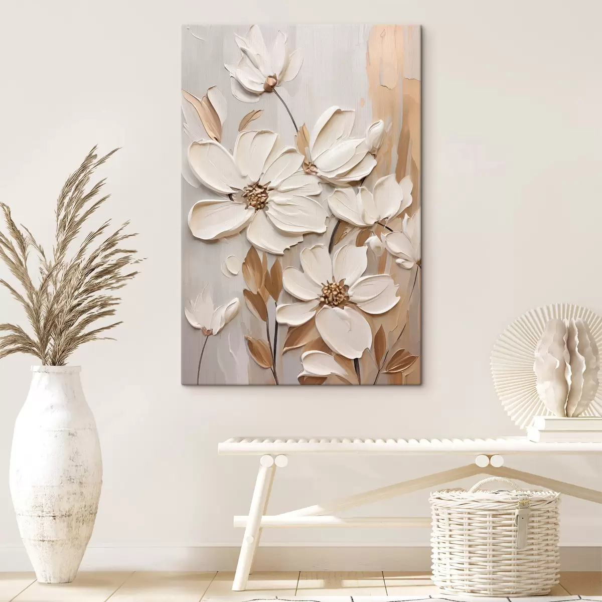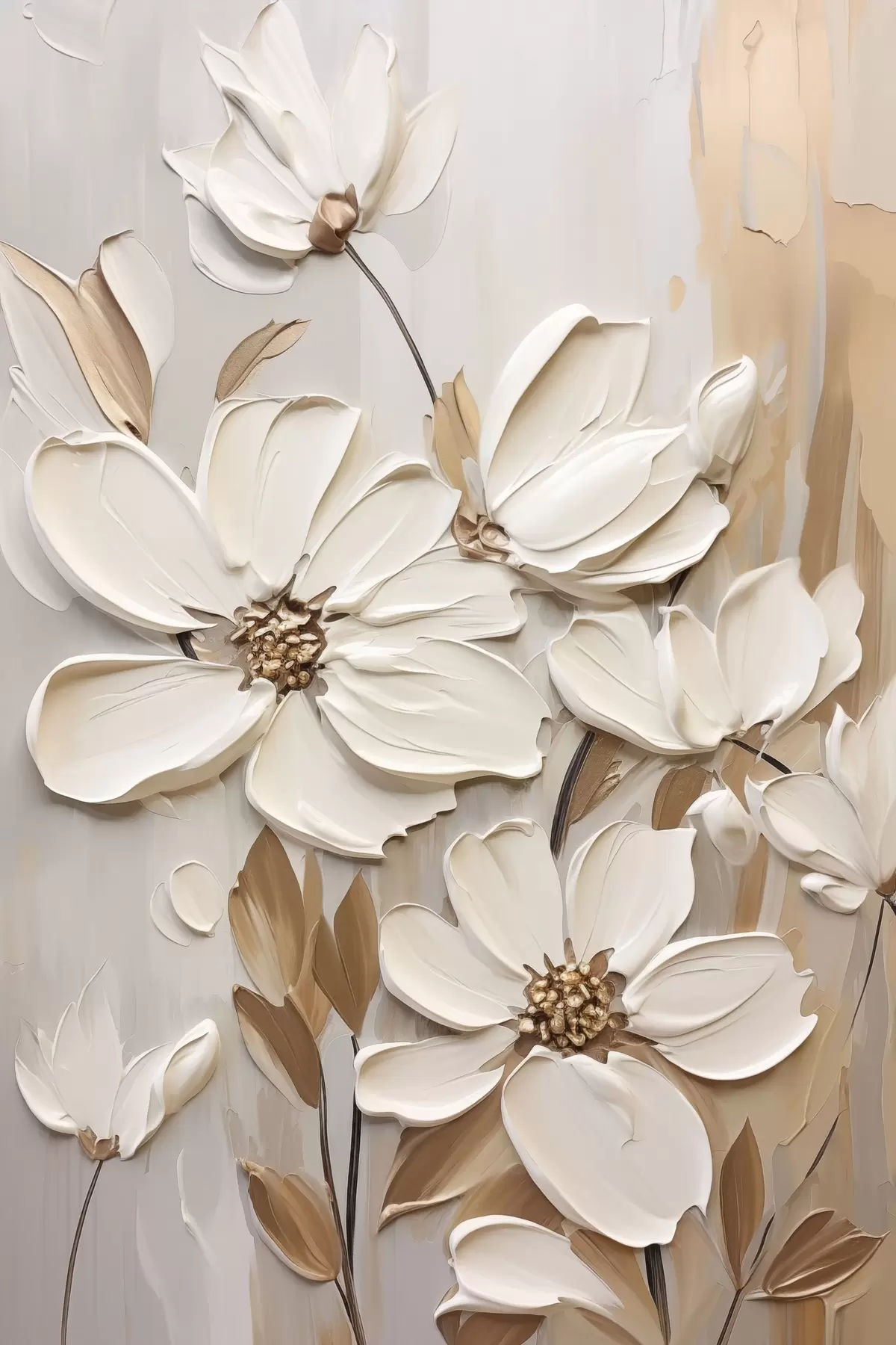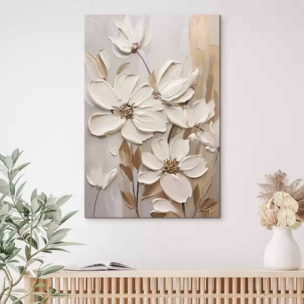 Obraz Abstrakcyjne białe kwiaty z teksturowanymi płatkami na neutralnym tle z subtelnymi pociągnięciami pędzla imitującymi Nr s47873