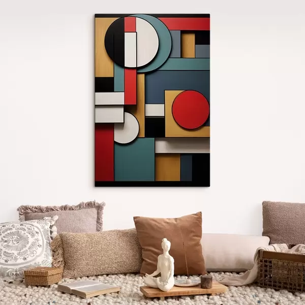 Obraz Abstrakcyjna kompozycja geometryczna z imitacją tekstury drewna, czerwonymi, czarnymi, białymi i turkusowymi prostokątami i okręgami. s47875
