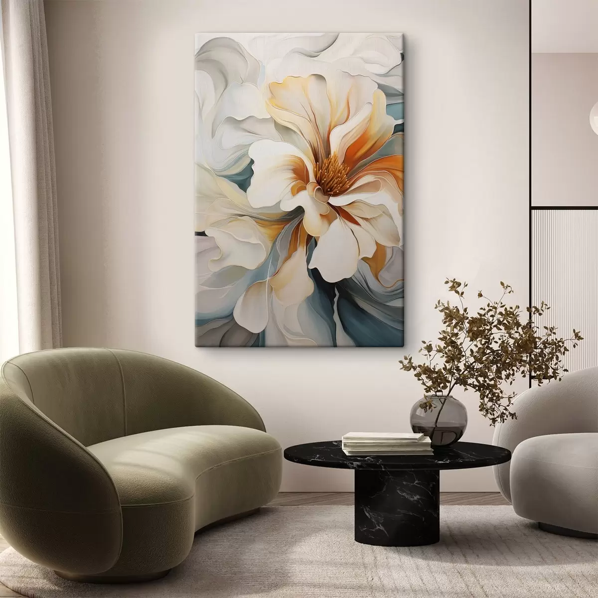 Obraz Abstrakcyjny duży kwiat z białymi, pomarańczowymi i turkusowymi płatkami, teksturowane tło Nr s47877