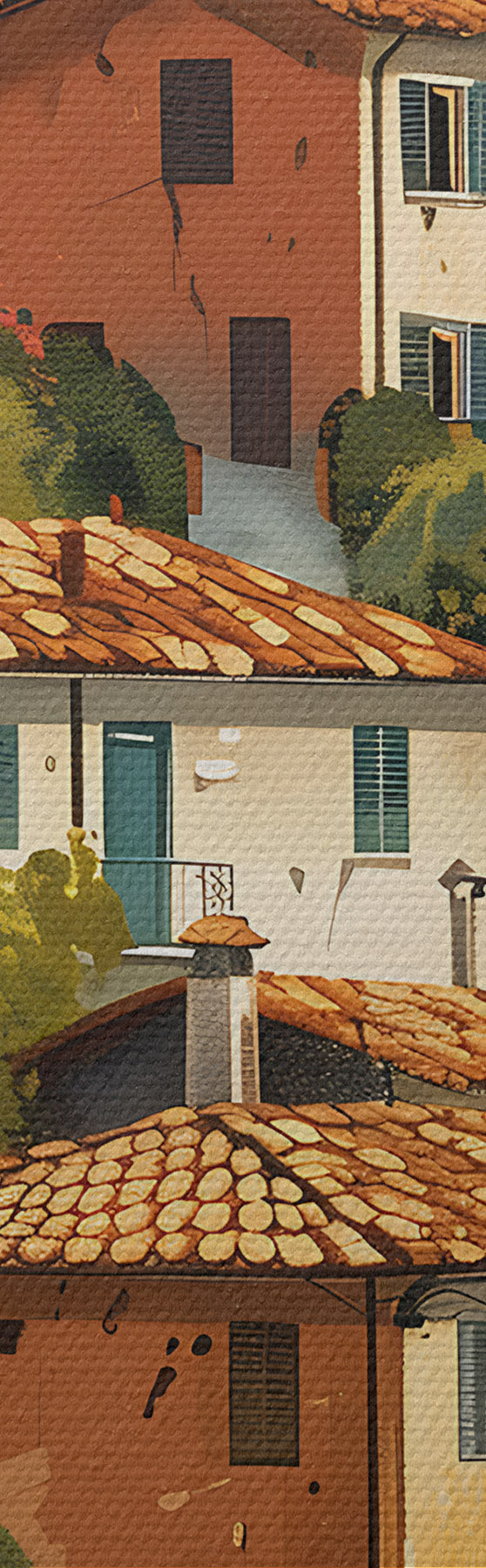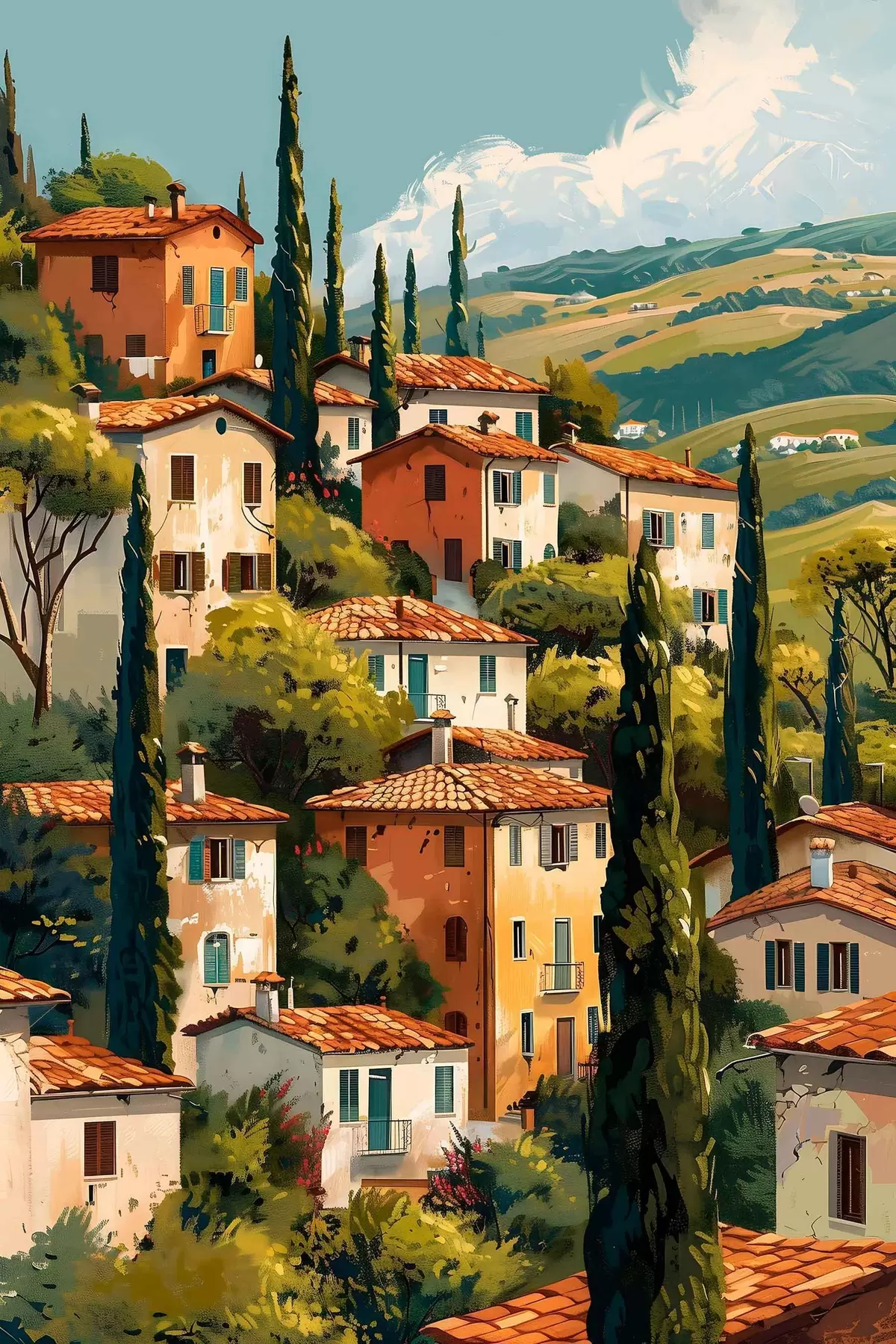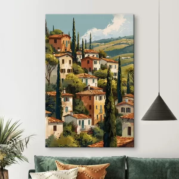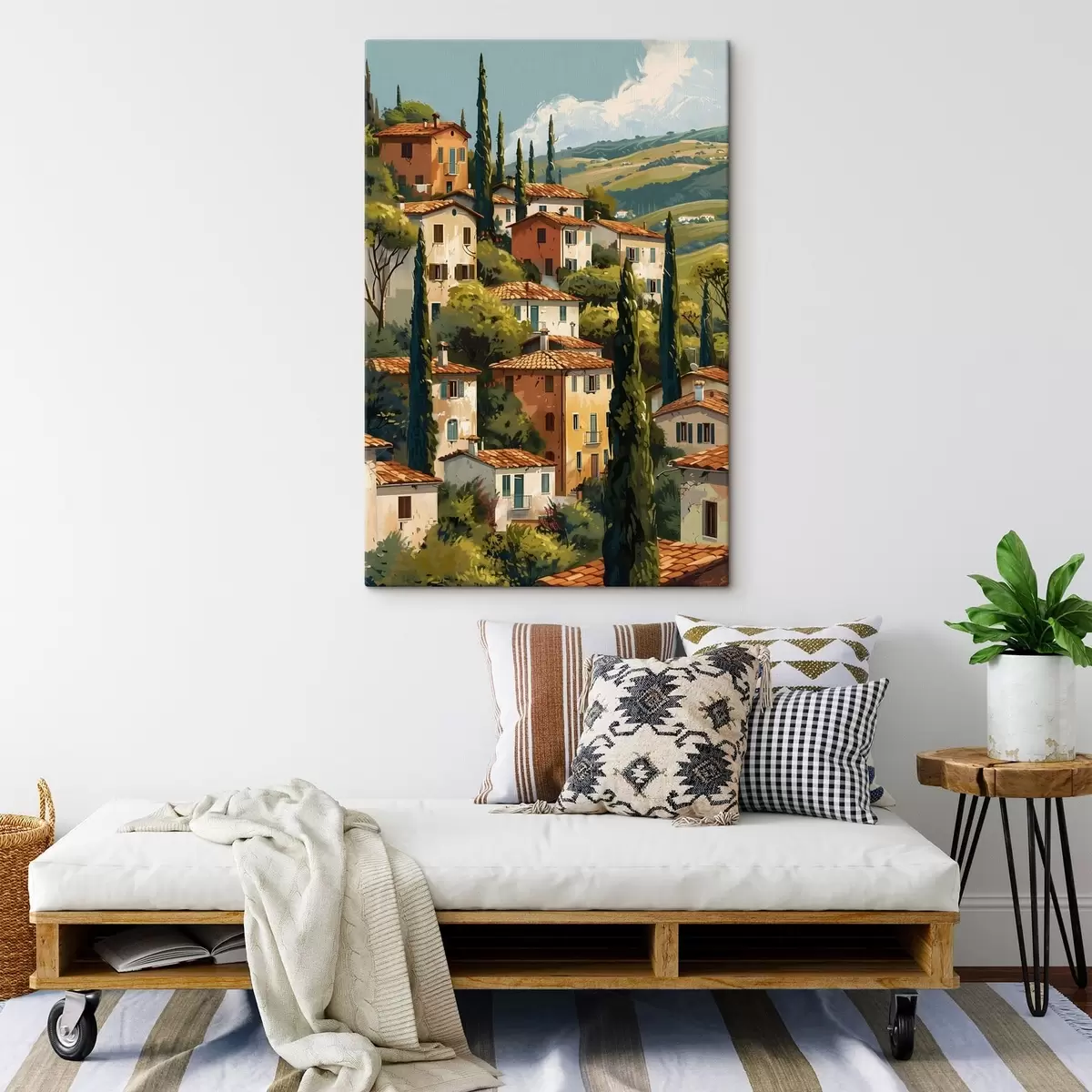 Obraz śródziemnomorska wioska na wzgórzu, domy w ciepłych kolorach z dachami z terakoty Nr s47950