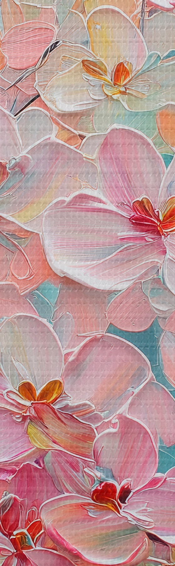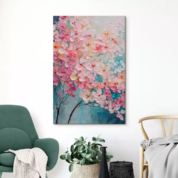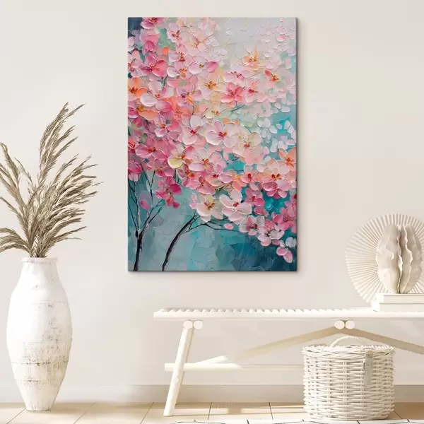 Obraz Gałąź z różowymi kwiatami na niebieskim tle w stylu malarstwa olejnego Nr s47987