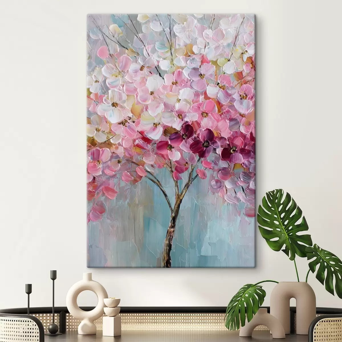Sprzedajemy obrazy na blejtramie - jest to drewniana rama, na którą naciągnięte jest płótno. Tego obrazu nie trzeba oprawiać; można go powiesić bezpośrednio na ścianie.