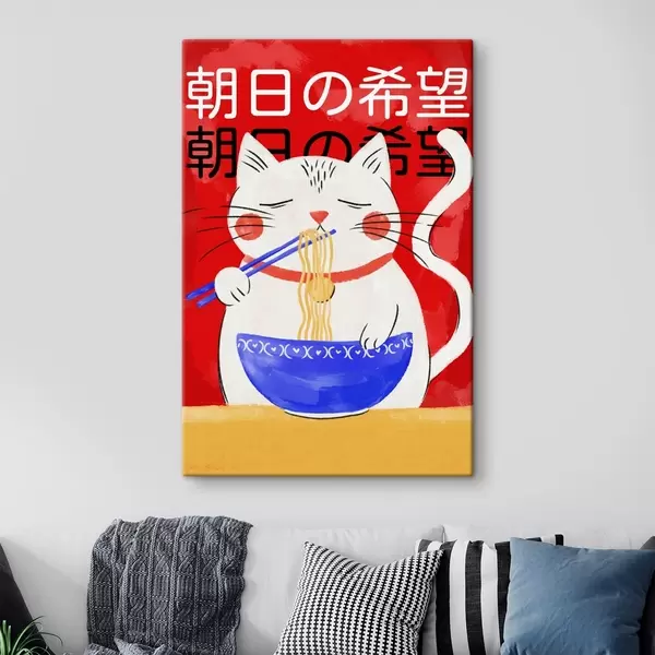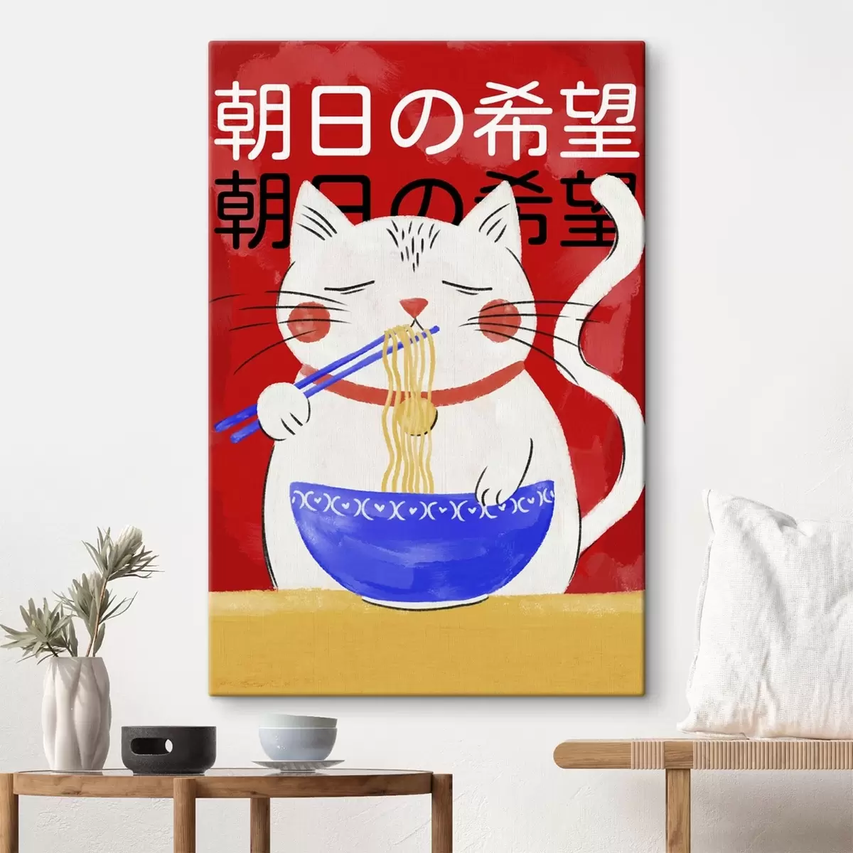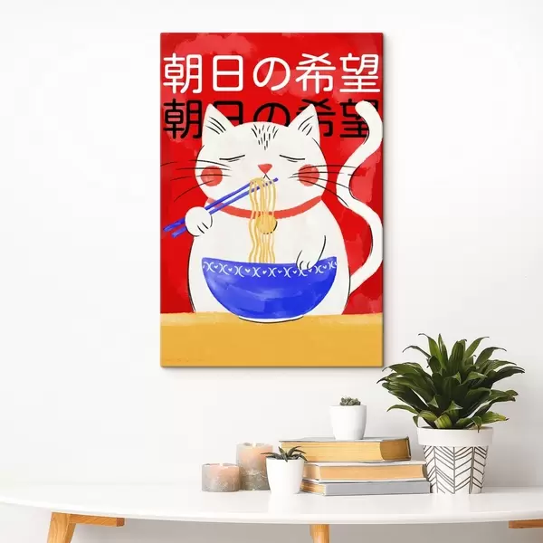 Obraz Ilustracja przedstawiająca kota jedzącego makaron na czerwonym tle Nr s48031