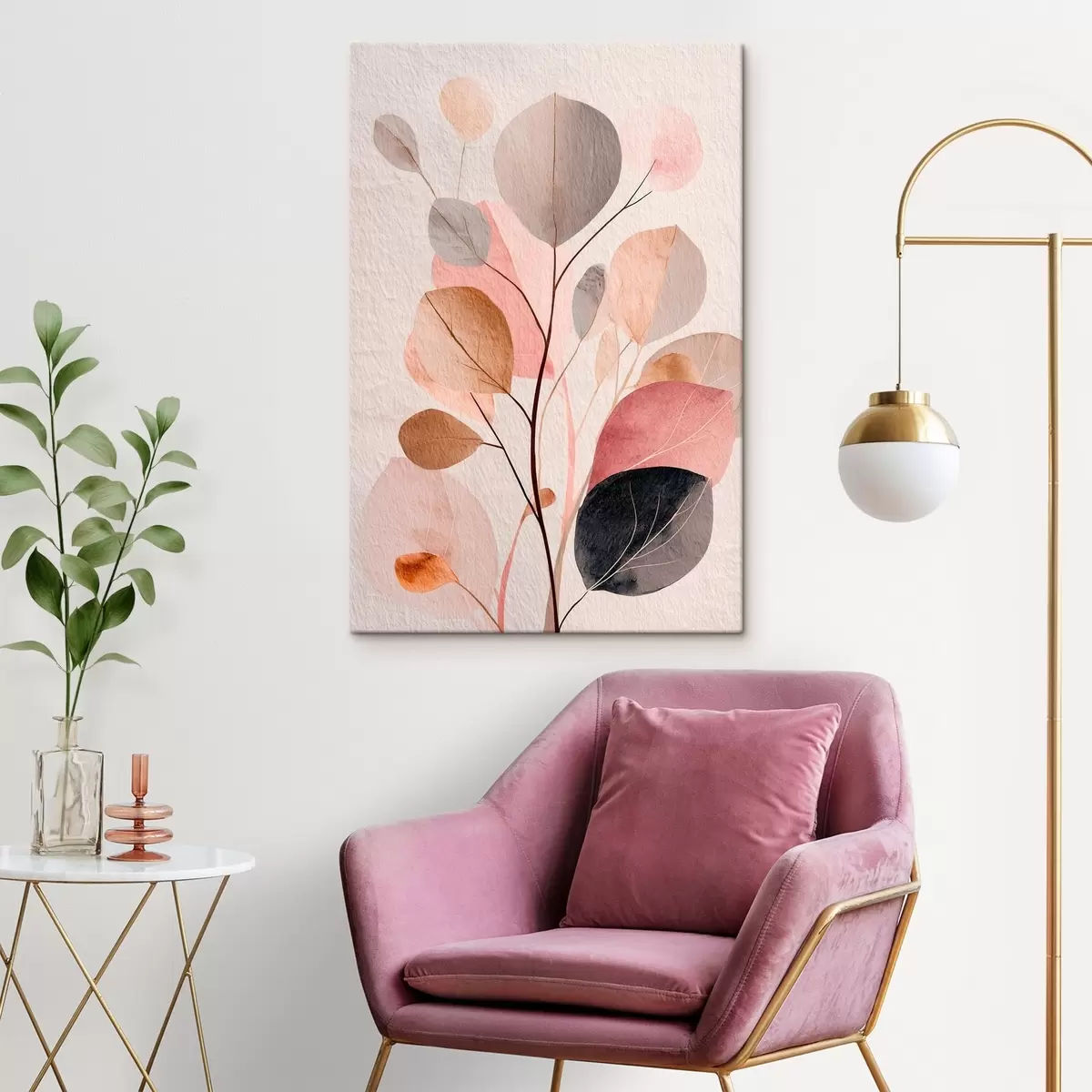 Obraz Abstrakcyjna gałązka z okrągłymi liśćmi w ciepłych odcieniach beżu i koralowca Nr s48187