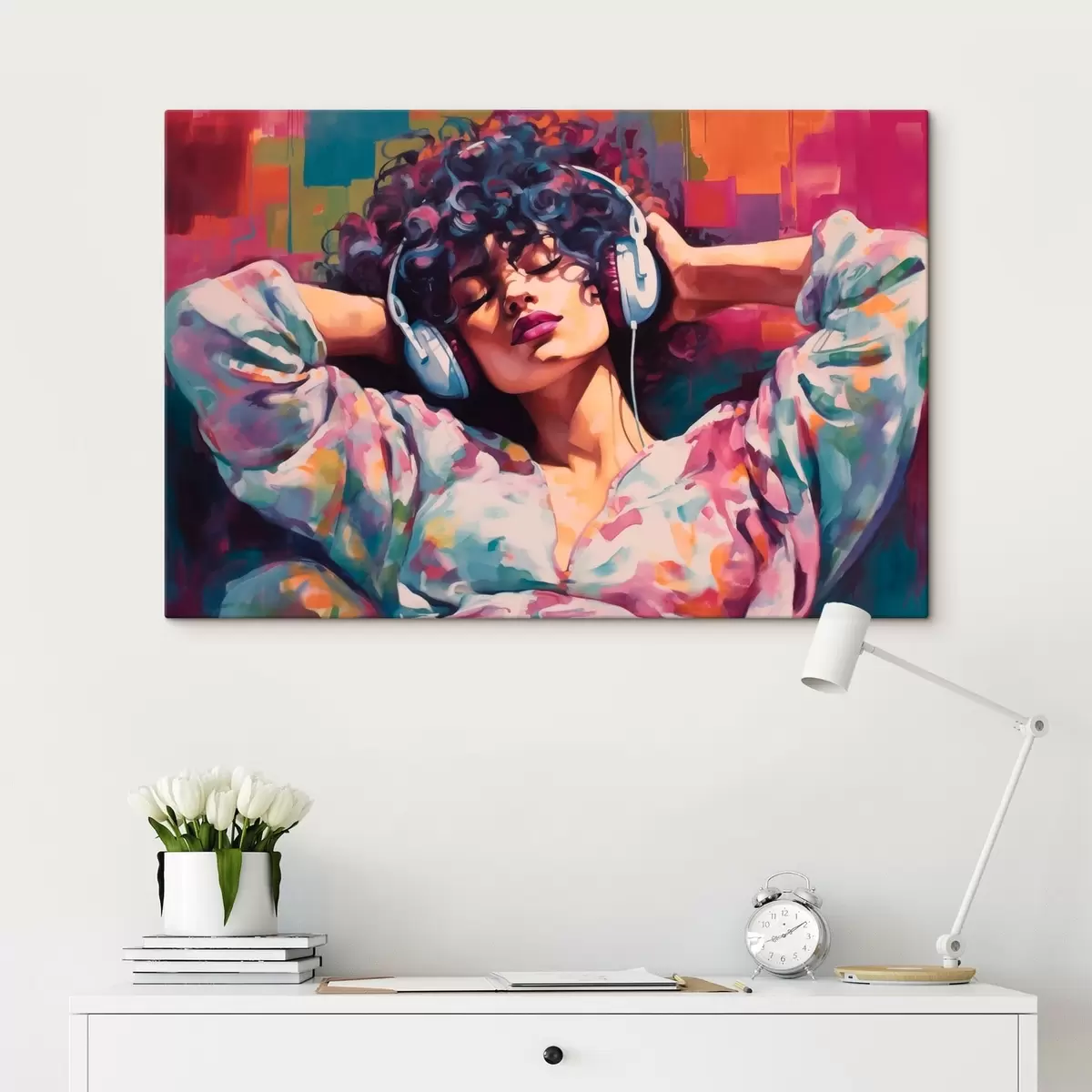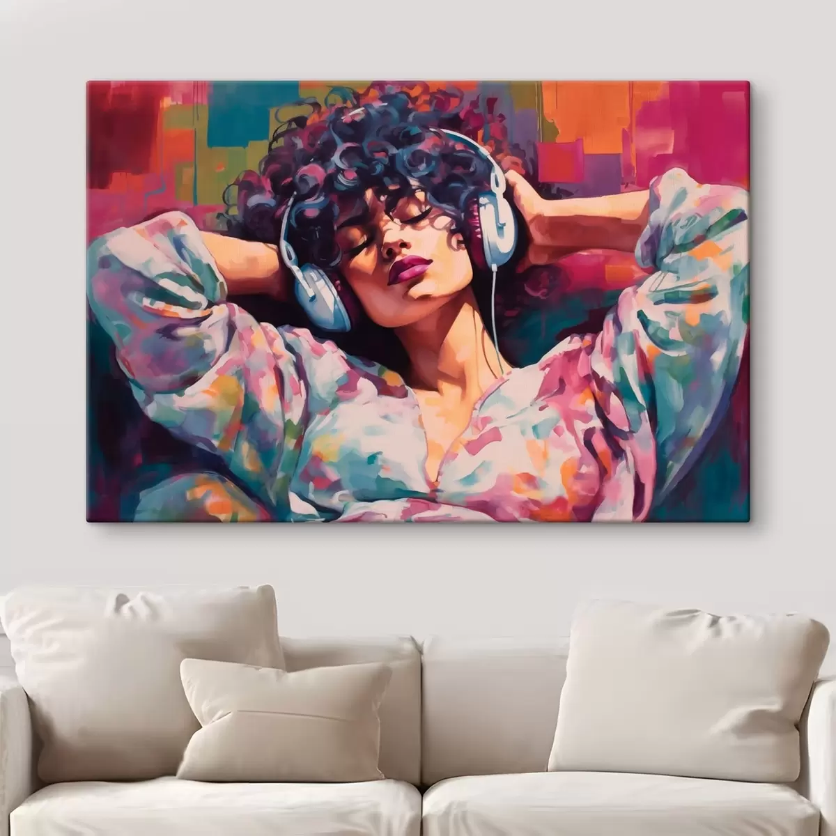 Obraz Kobieta w słuchawkach w stylu kolorowej malowidła Nr s48335