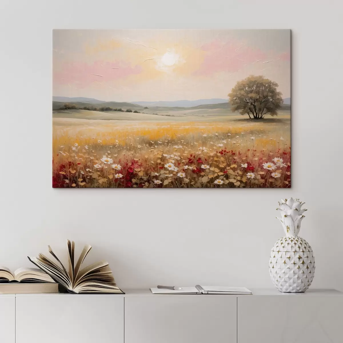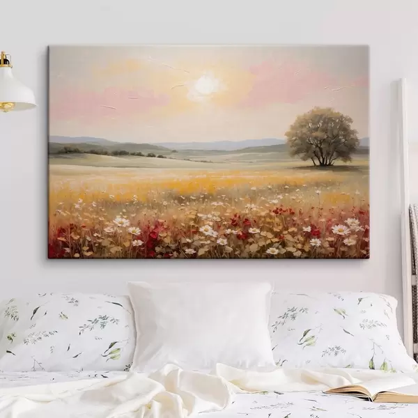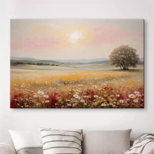 Obraz Krajobraz z polem kwiatów i drzewem na horyzoncie Nr s48355