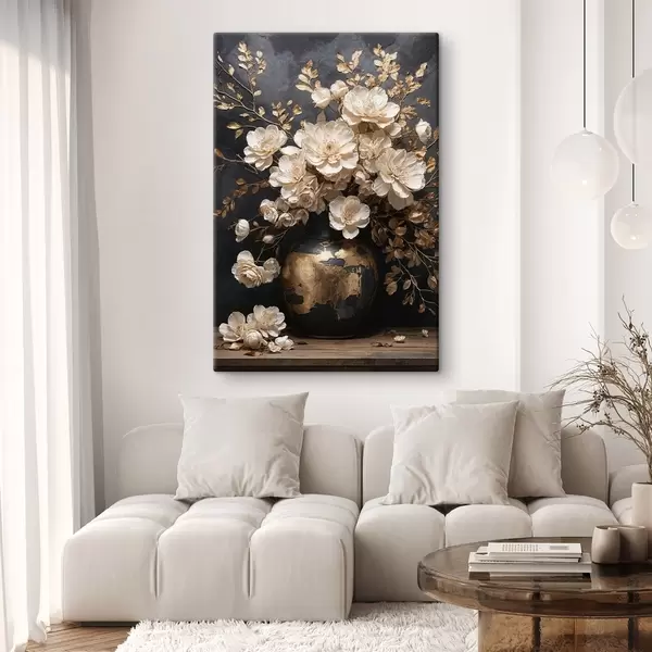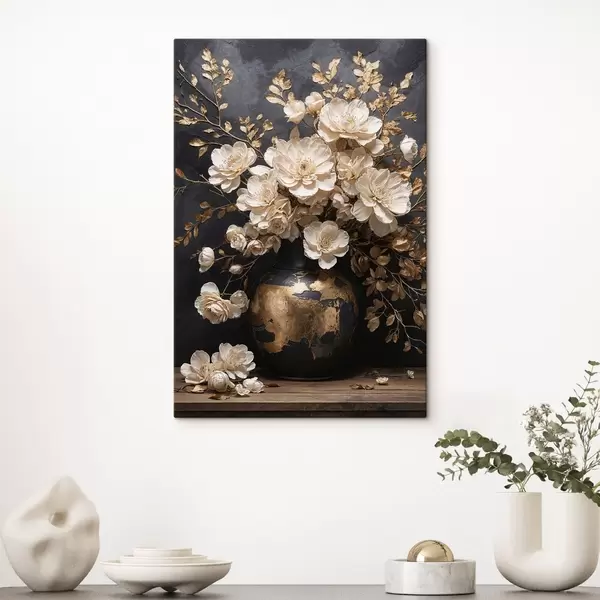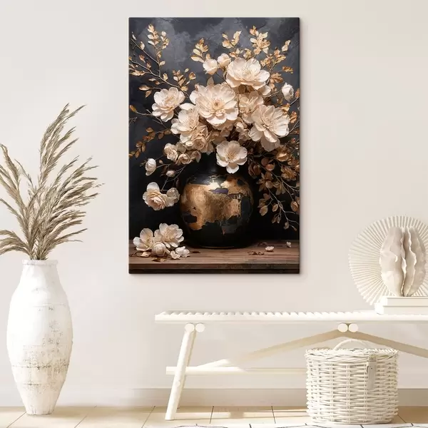 Obraz Jasne kwiaty w wazonie z ozdobnymi liśćmi Nr s48356