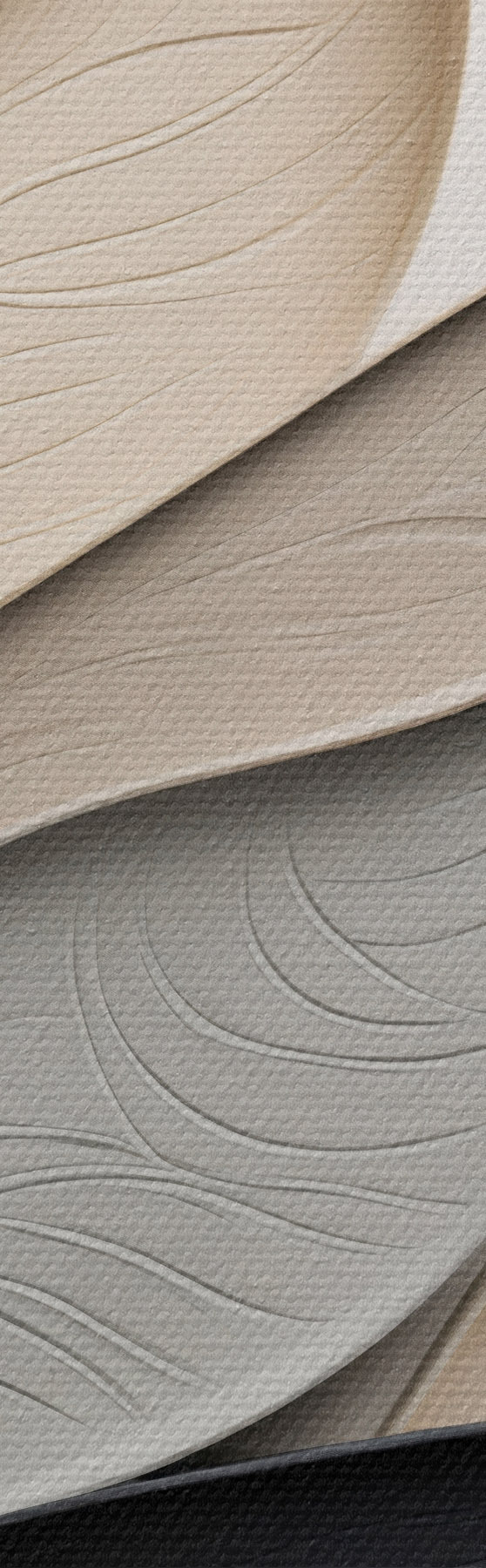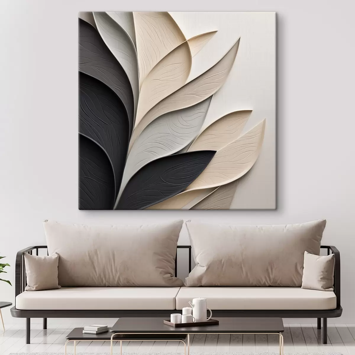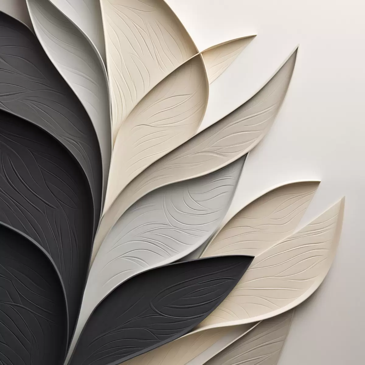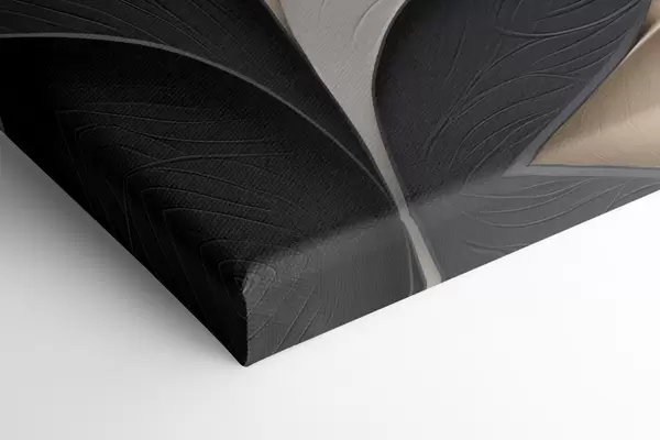 Obraz Kompozycja abstrakcyjna złożona z ułożonych warstwowo liści, zakrzywionych kształtów w kolorach czarnym, białym i beżowym oraz teksturowanych elementów Nr s48382