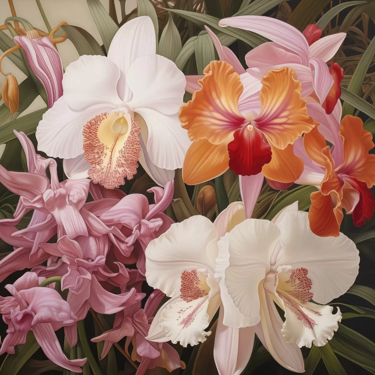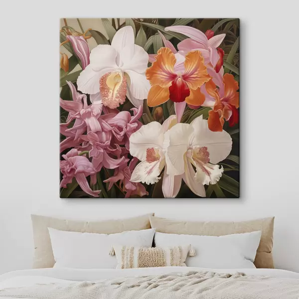 Obraz Bukiet tropikalnych kwiatów, orchidee na tle zielonej roślinności Nr s48385