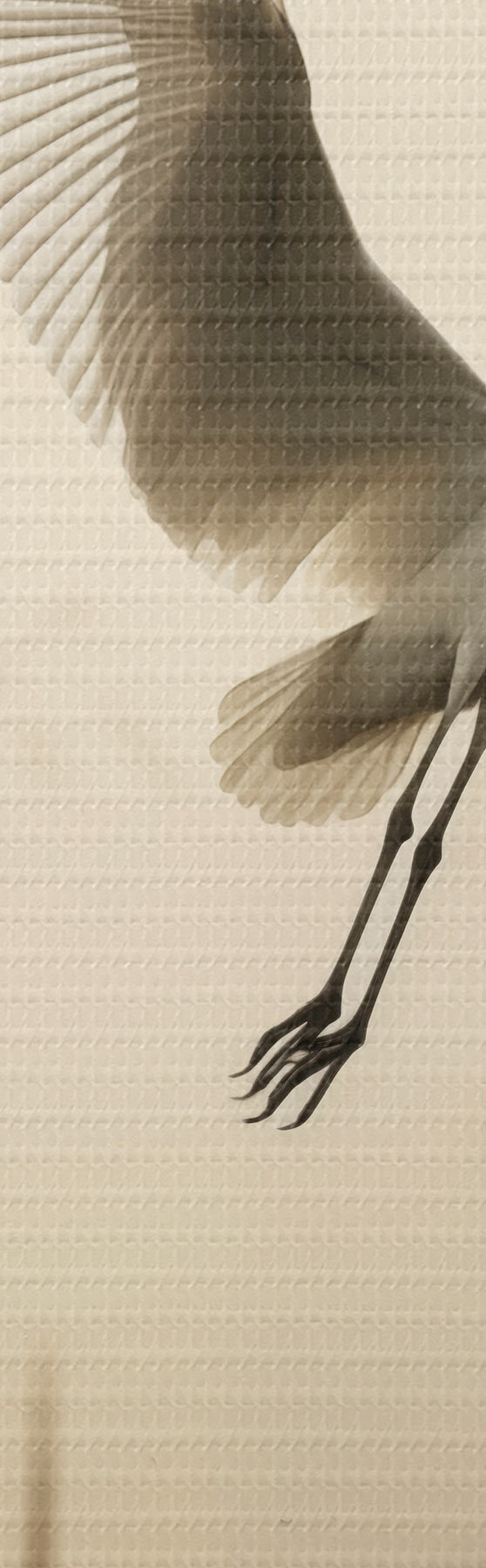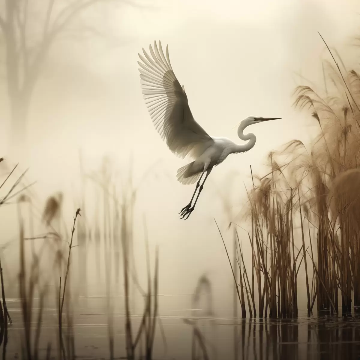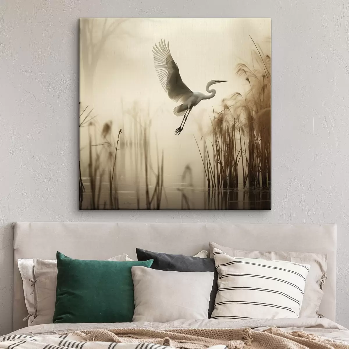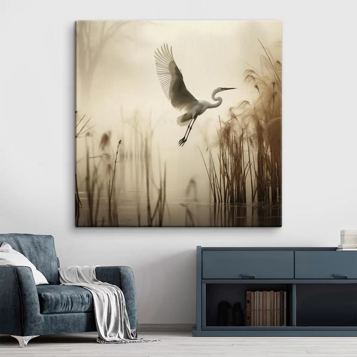 Obraz Biała czapla przelatuje nad jeziorem, otoczona wysokimi trzcinami i drzewami w tle Nr s48389