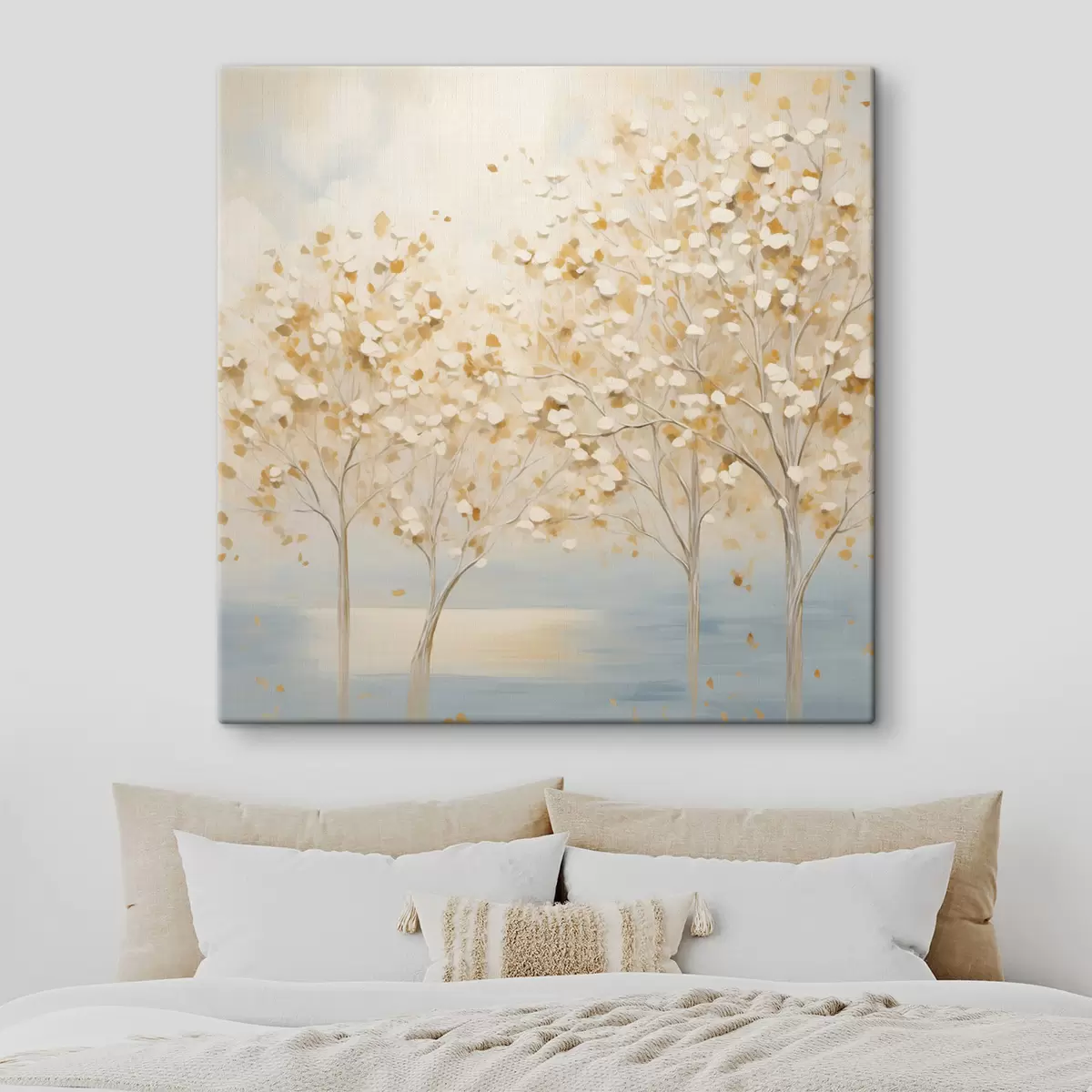 Obraz Obraz przedstawiający drzewa o fakturalnym wyglądzie, z białymi i żółtymi liśćmi na jasnoniebieskim tle s48392