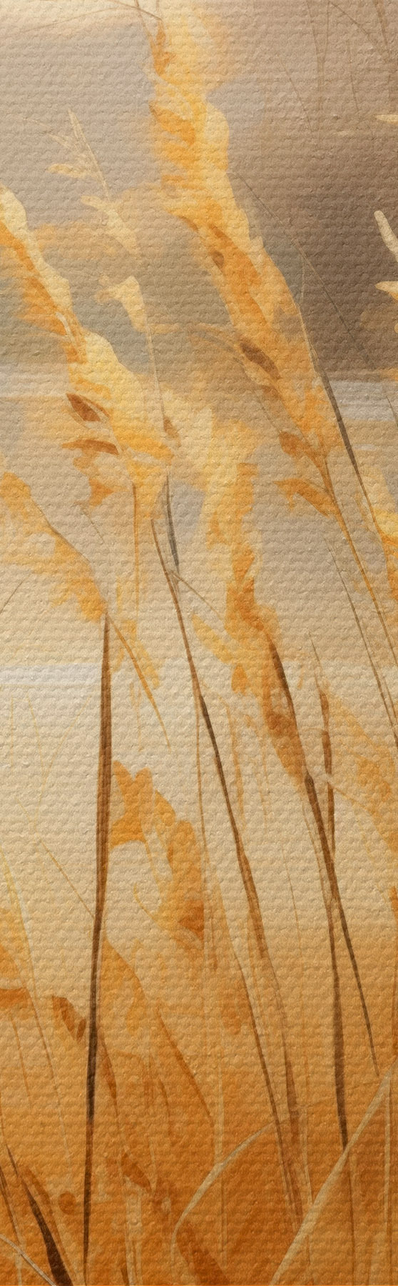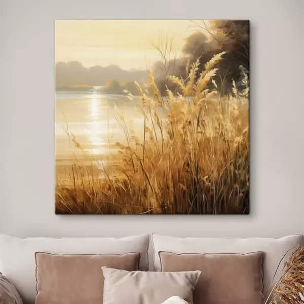 Obraz Na pierwszym planie wysoka, wyschnięta trawa z kłoskami, a w tle jezioro i drzewa Nr s48393