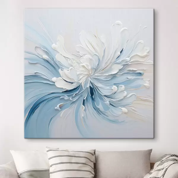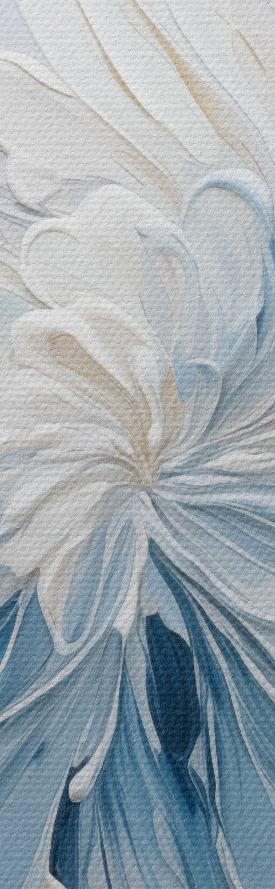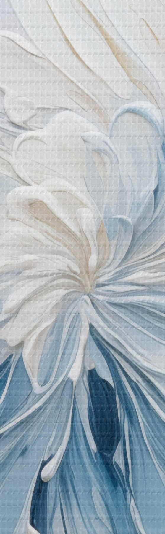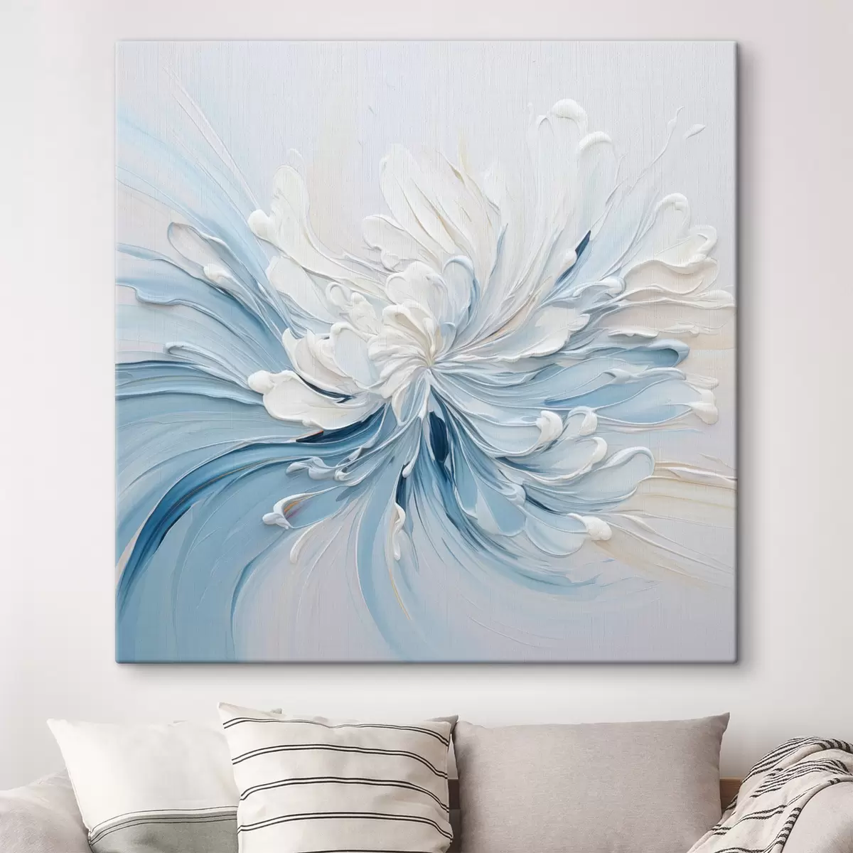 Obraz Biało-jasnoniebieski abstrakcyjny wzór kwiatowy z teksturowanymi płatkami i wijącymi się liniami Nr s48396