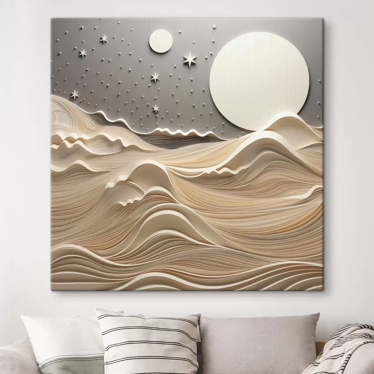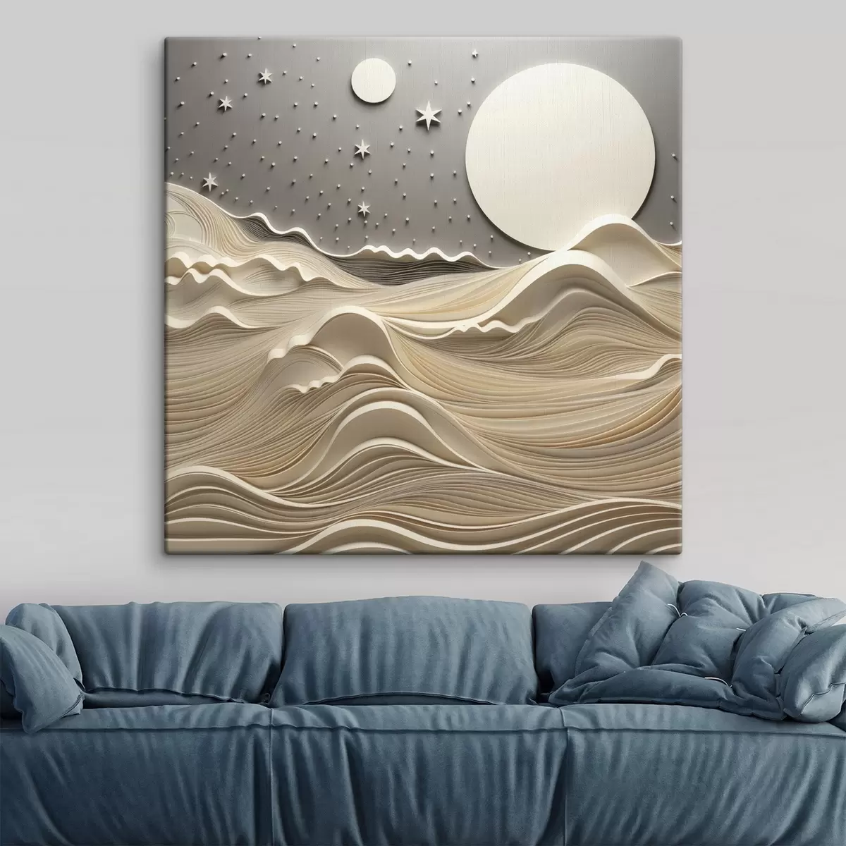 Obraz Minimalistyczny, stylizowany pejzaż z falistymi wzgórzami i wielkim księżycem na gwiaździstym niebie; sztuka abstrakcyjna s48401