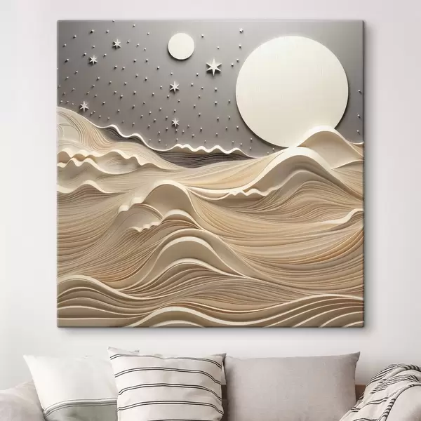 Obraz Minimalistyczny, stylizowany pejzaż z falistymi wzgórzami i wielkim księżycem na gwiaździstym niebie; sztuka abstrakcyjna Nr s48401