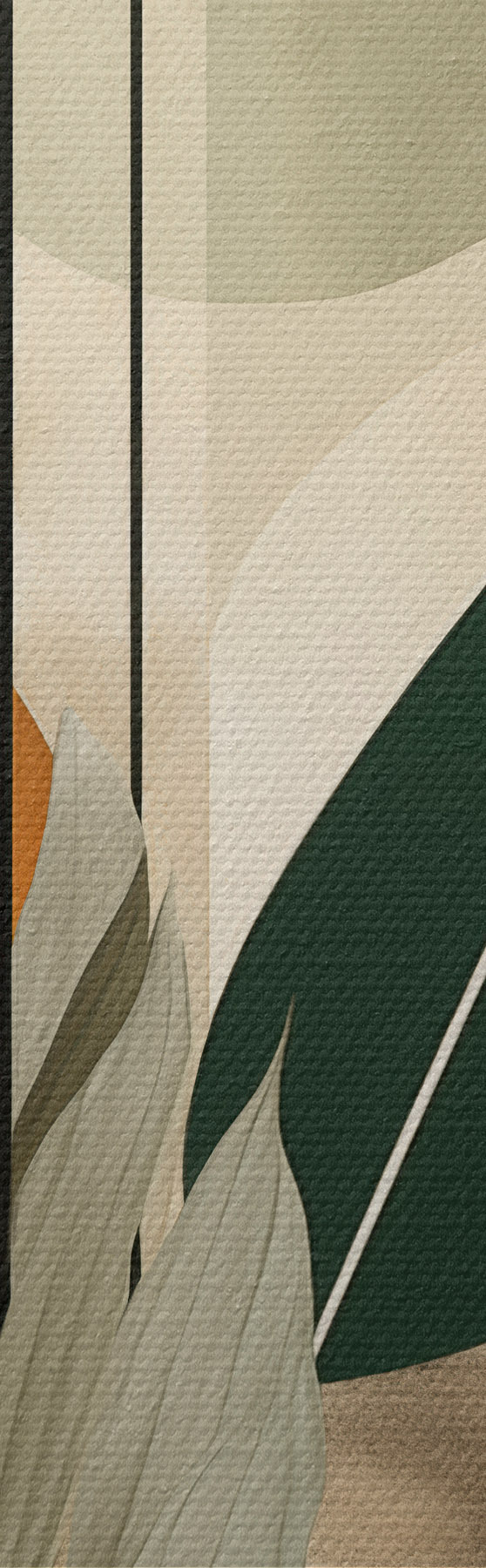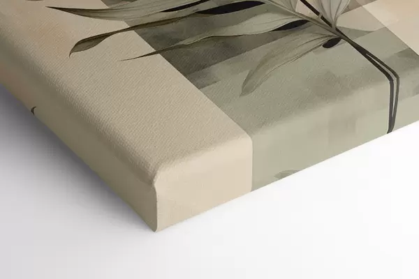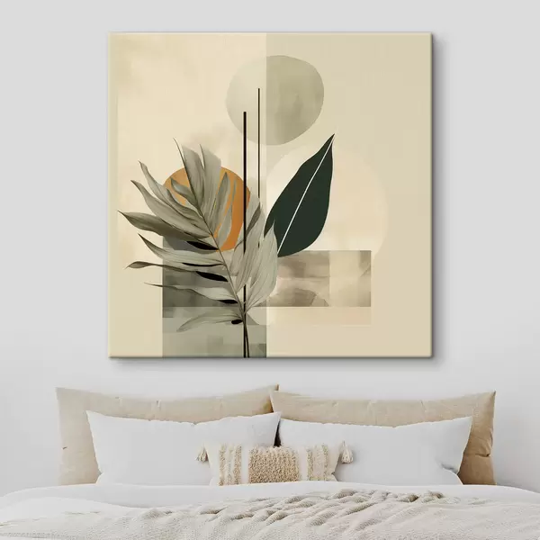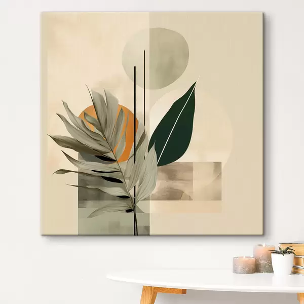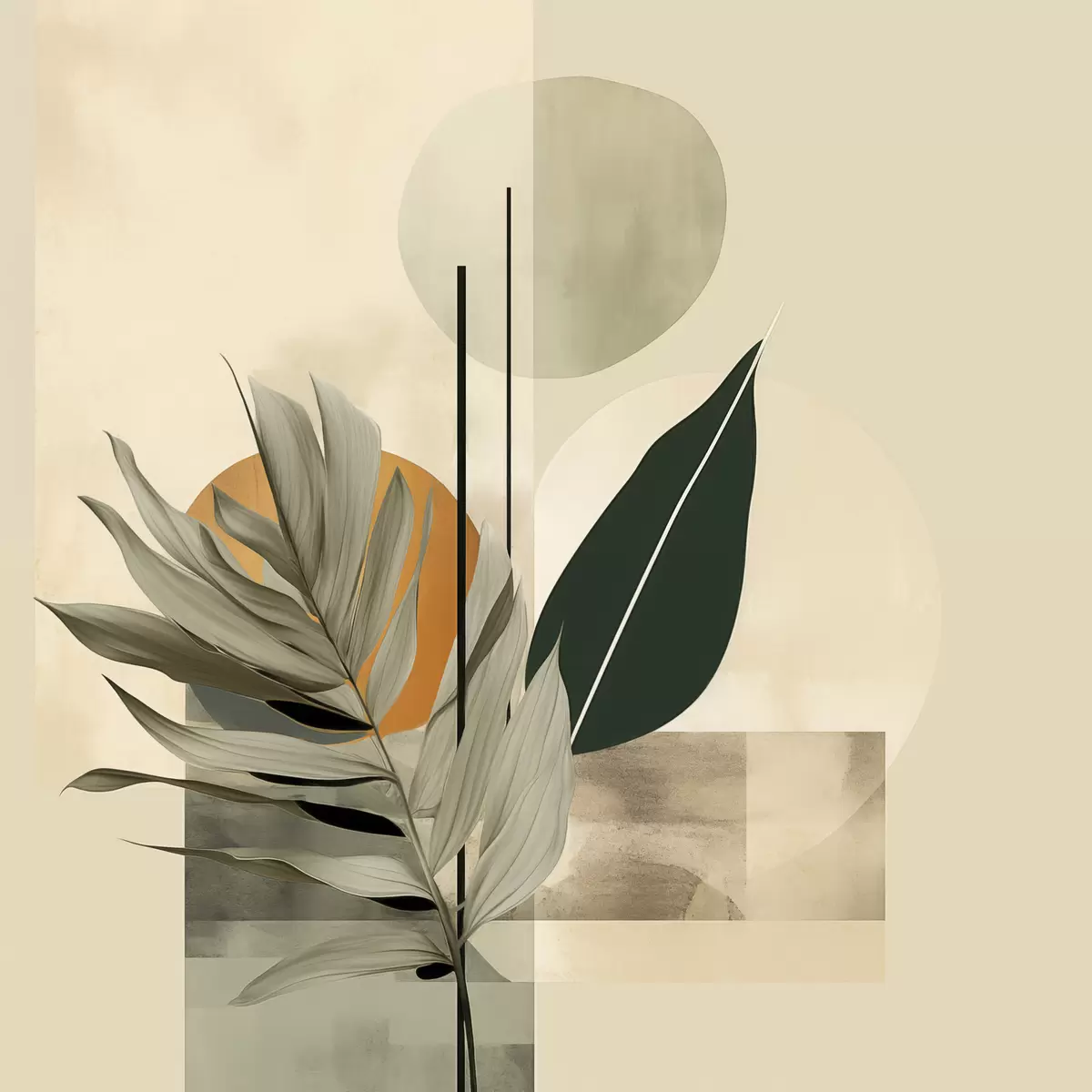 Obraz Ciemnozielona roślina z abstrakcyjnymi geometrycznymi kształtami i akwarelowymi fakturami w odcieniach beżu i zieleni Nr s48410