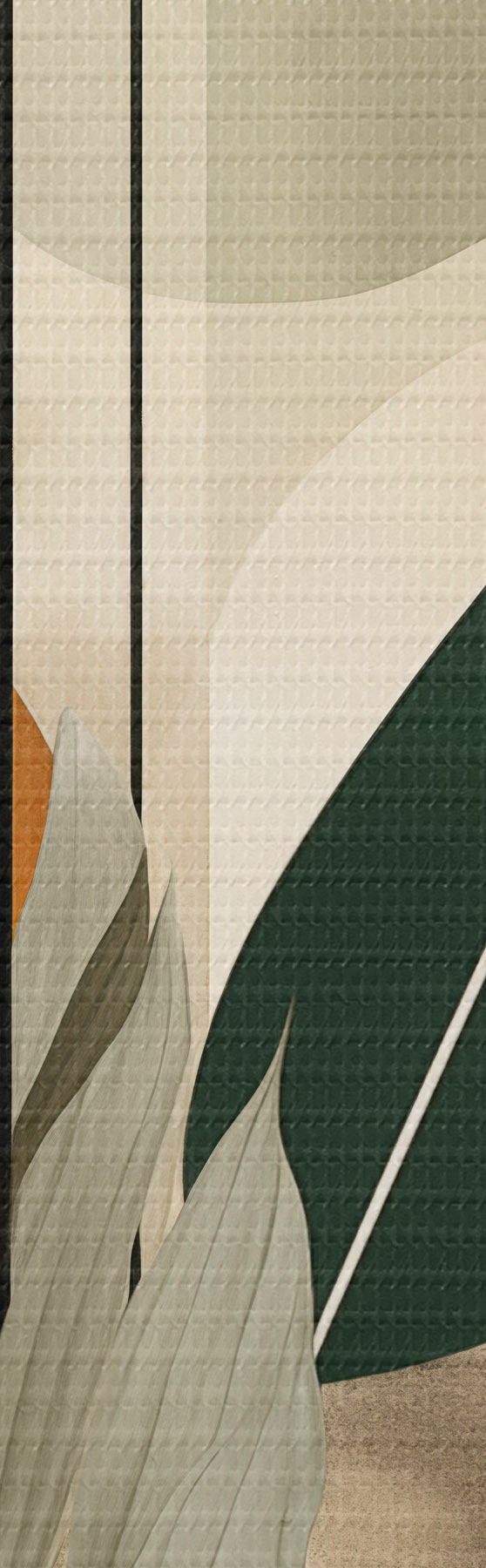 Obraz Ciemnozielona roślina z abstrakcyjnymi geometrycznymi kształtami i akwarelowymi fakturami w odcieniach beżu i zieleni s48410