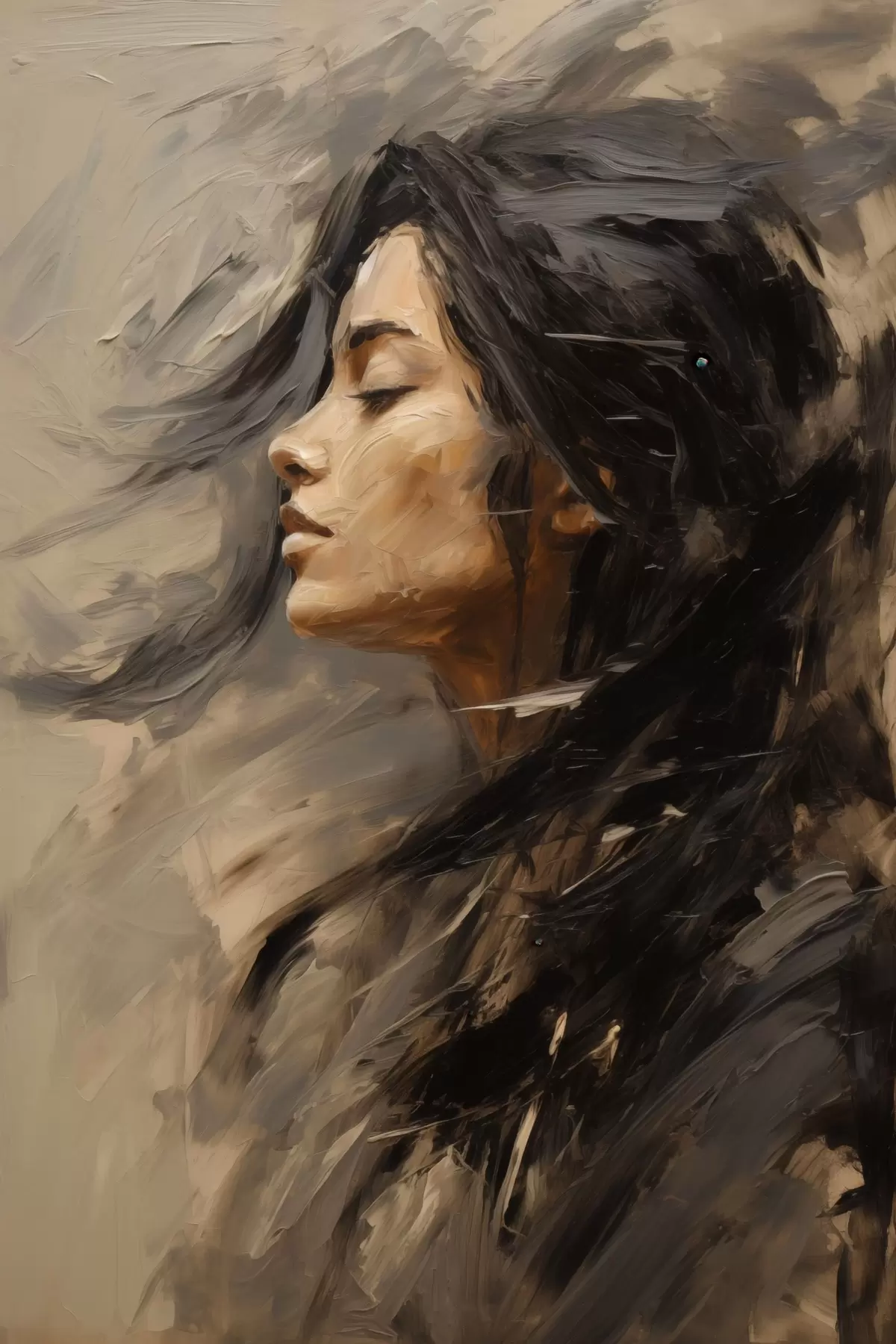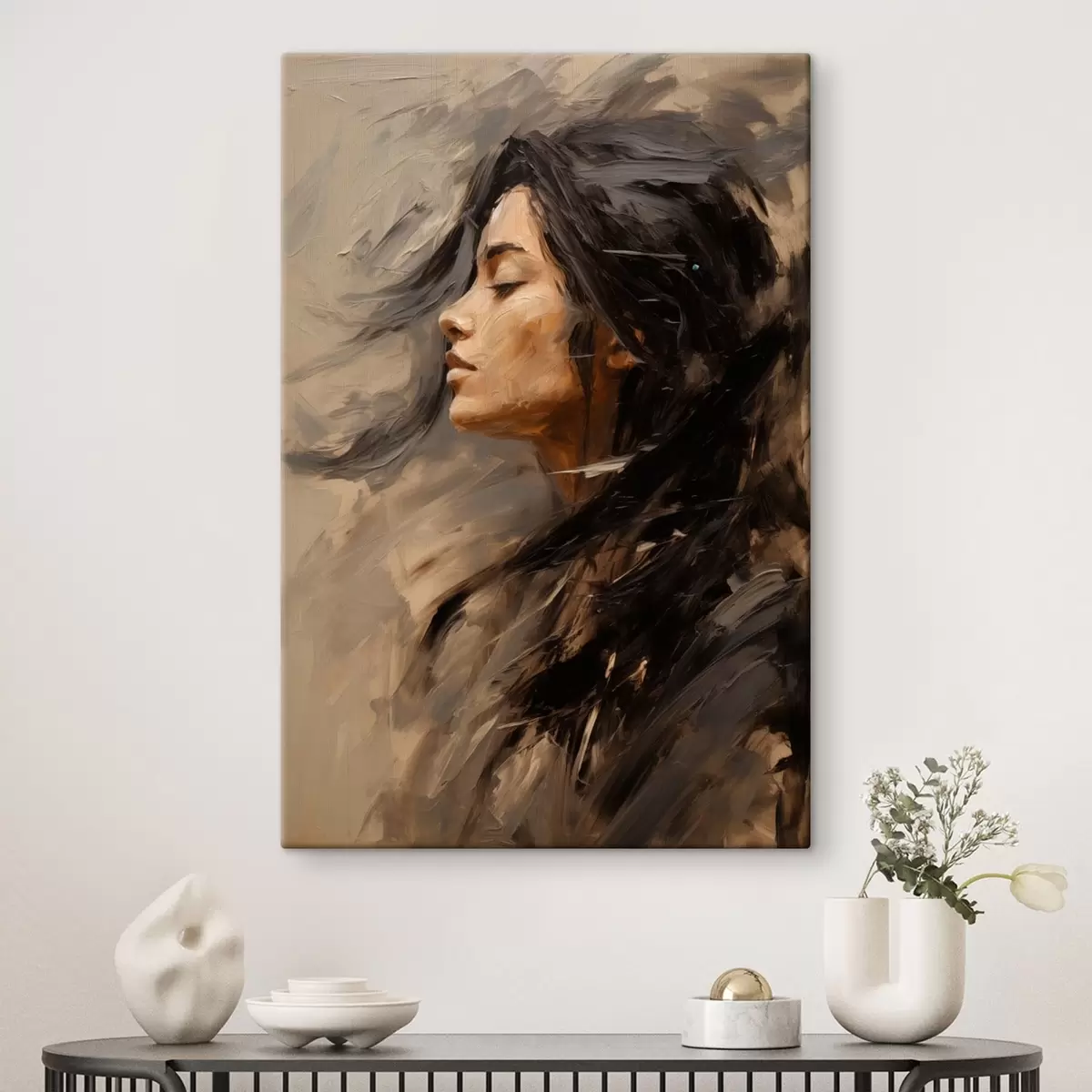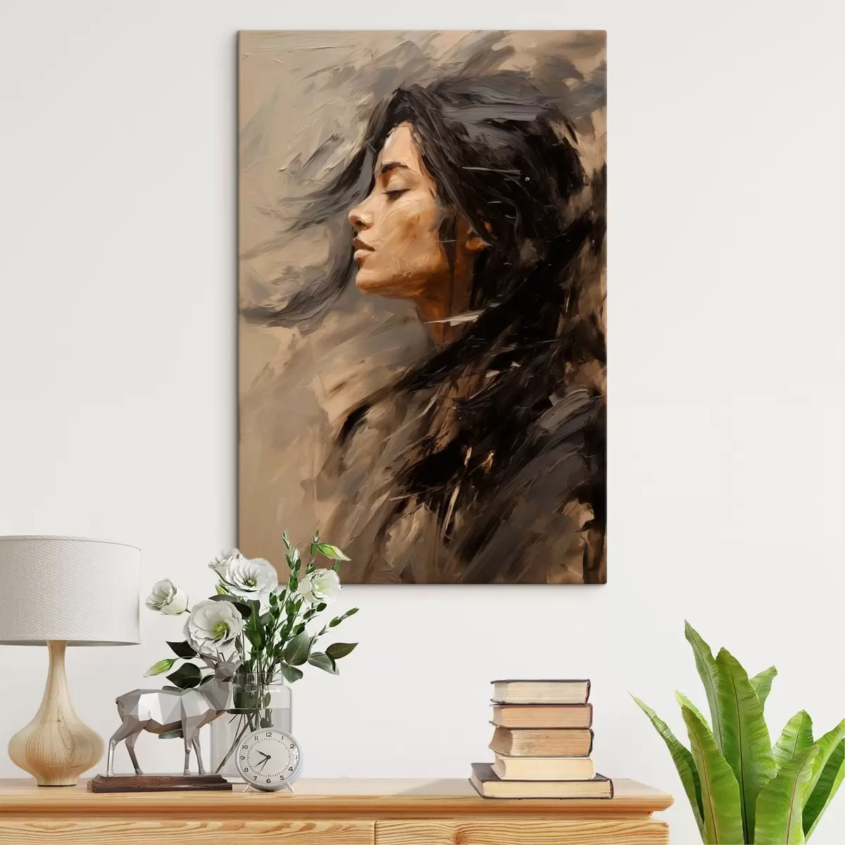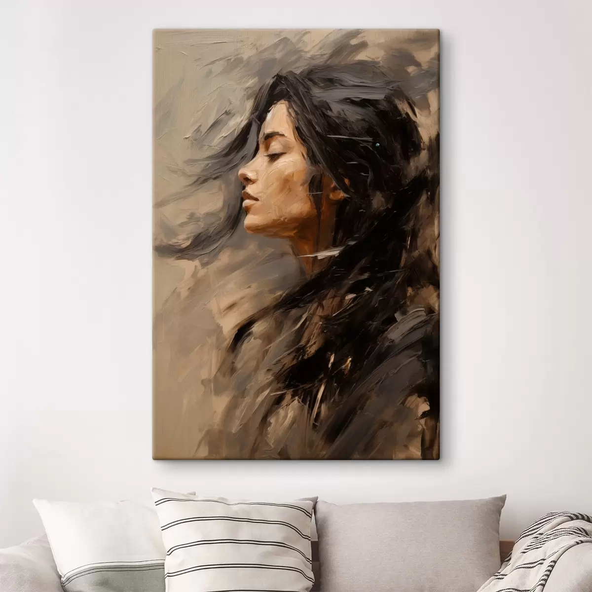 Obraz Kobiecy profil oddany za pomocą malarskich pociągnięć pędzla, w ciepłej kolorystyce Nr s48621