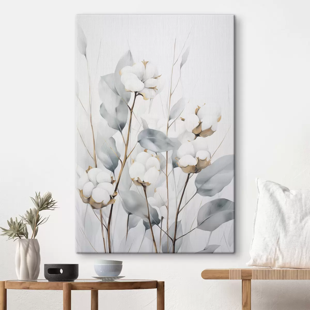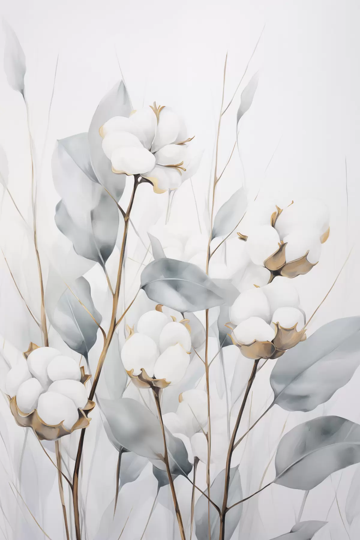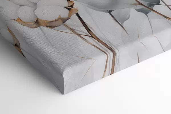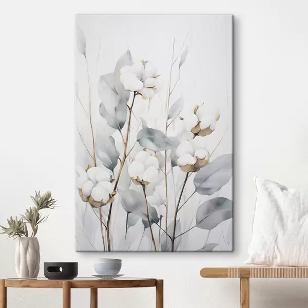 Obraz Biała roślina bawełny z jasnoniebiesko-zielonymi liśćmi na jasnym tle Nr s48743