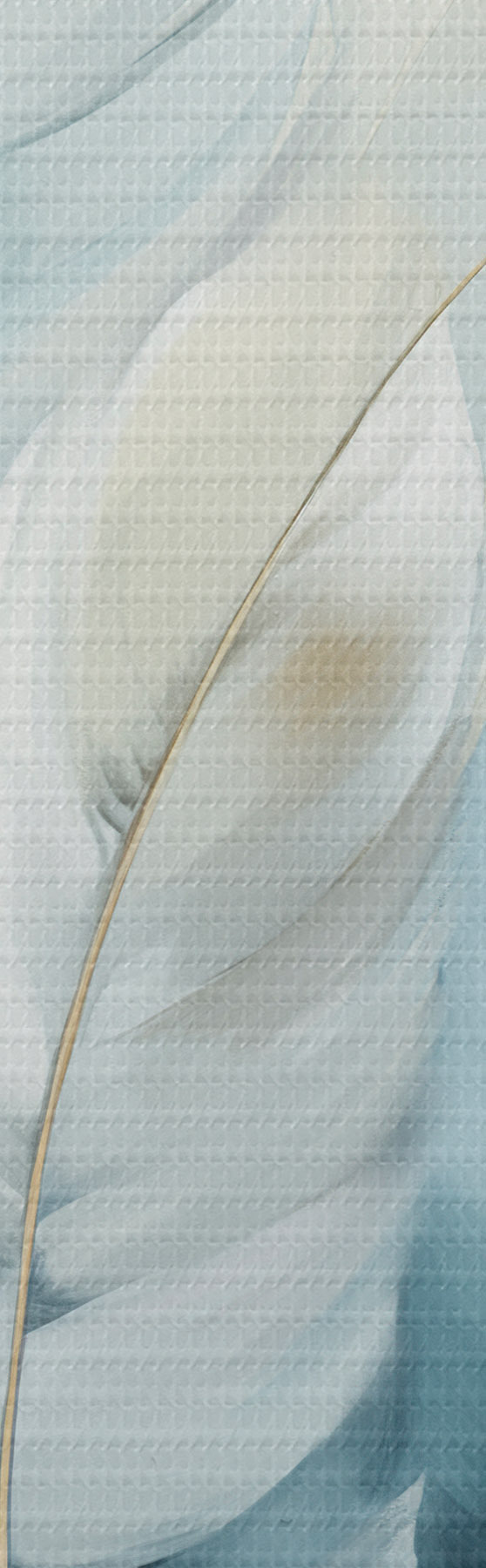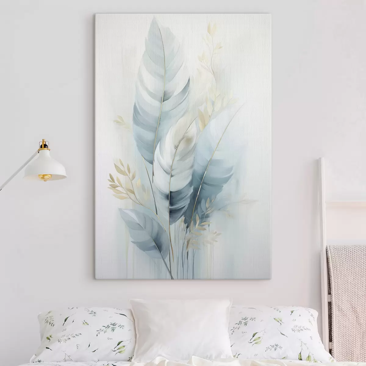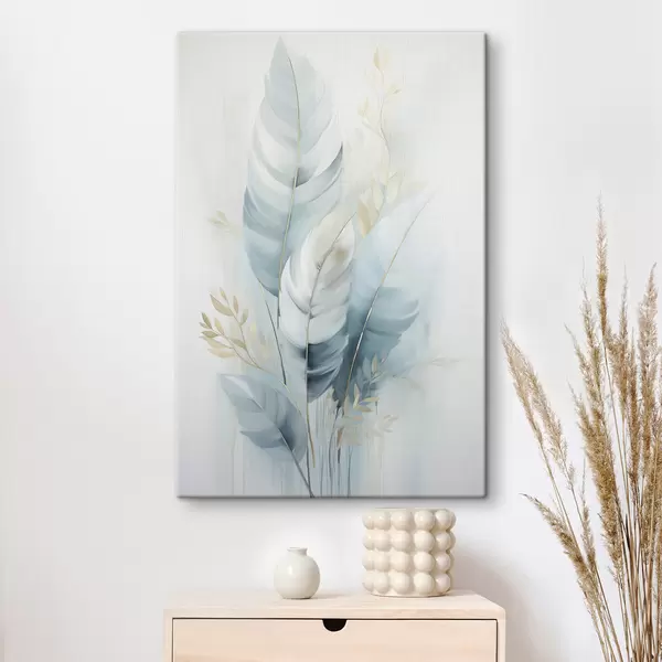 Obraz Duże, miękkie pióra w odcieniach błękitu i bieli z delikatnymi beżowymi liśćmi Nr s48749