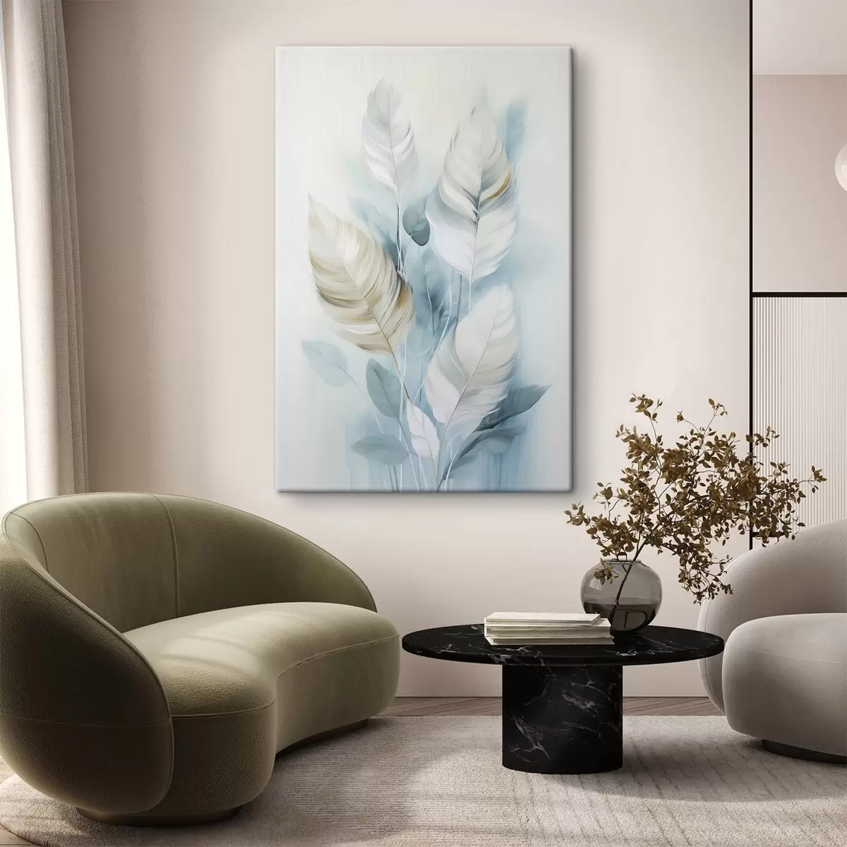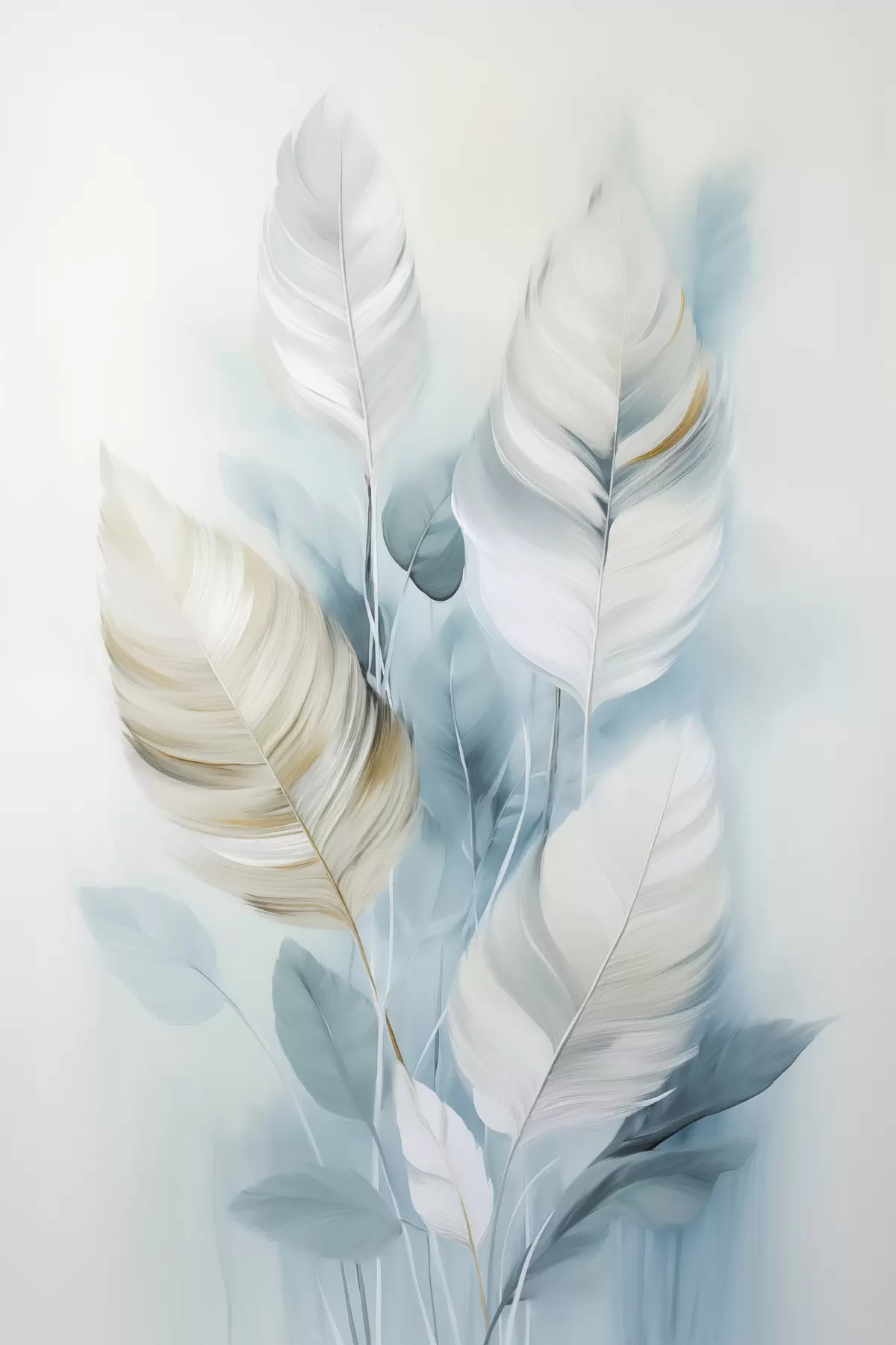 Obraz Duże, miękkie pióra w odcieniach błękitu i bieli z delikatnymi beżowymi liśćmi Nr s48750