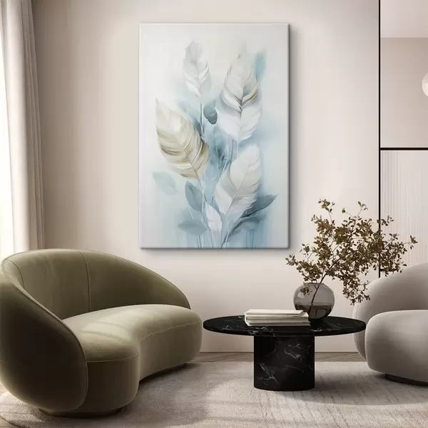 Obraz Duże, miękkie pióra w odcieniach błękitu i bieli z delikatnymi beżowymi liśćmi s48750