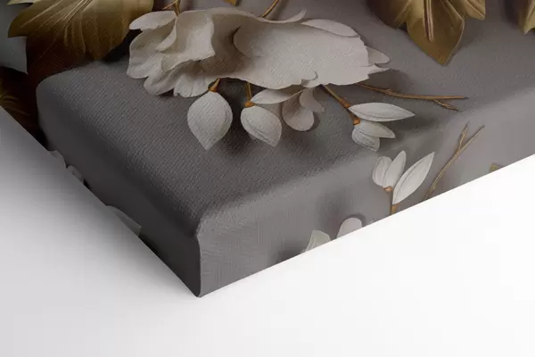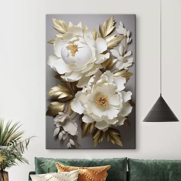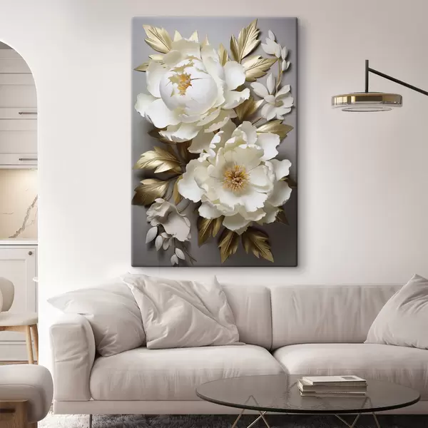 Obraz Duże białe piwonie z żółtymi liśćmi na szarym tle Nr s48753