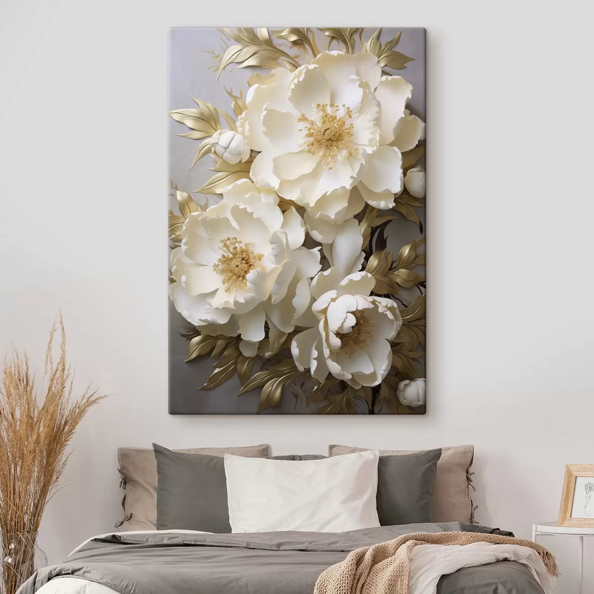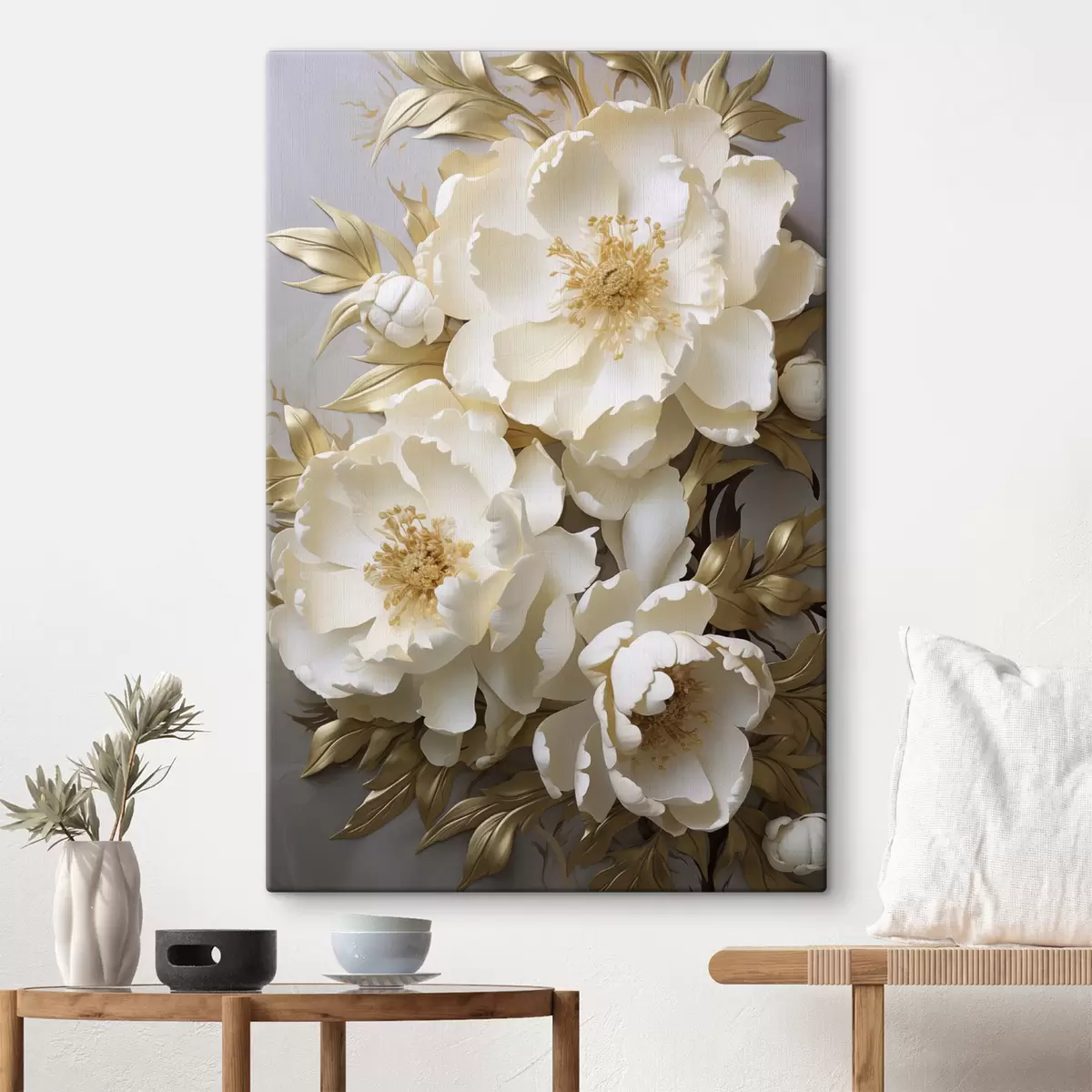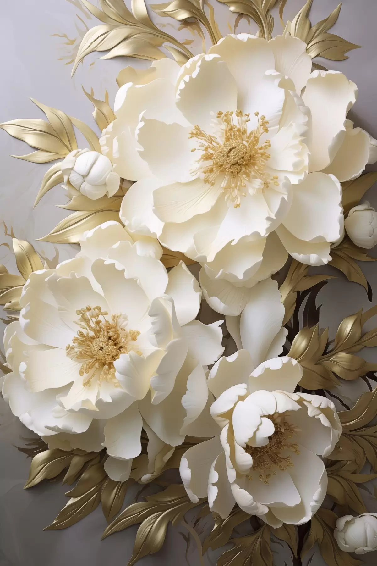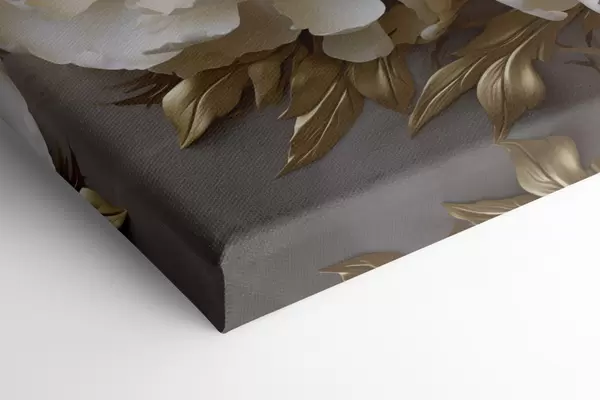 Obraz Duże białe piwonie z żółtymi liśćmi na szarym tle Nr s48754